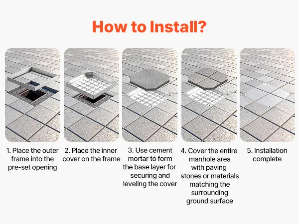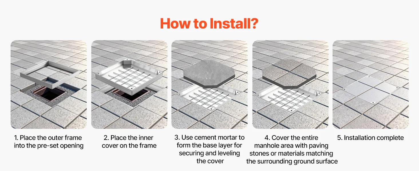 Follow a few simple steps to install the manhole cover and frame securely, allowing it to blend seamlessly with the surrounding surface.