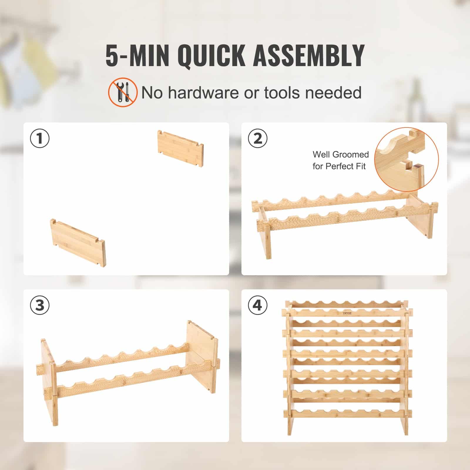 Mūsu bambusa vīna plaukta uzstādīšana ir ātra un vienkārša, aizņemot tikai 5 minūtes, un tam nav nepieciešami instrumenti vai aparatūra. Varat arī sakraut plauktus tik daudzās kārtās, cik vēlaties.