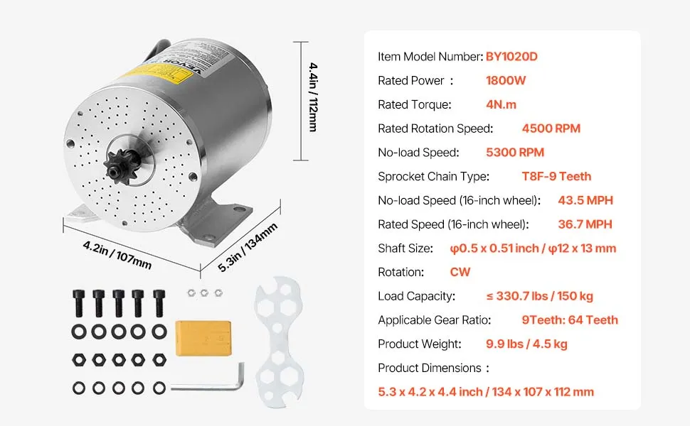 VEVOR 1800W Electric Brushless DC Motor 48V 4500rpm Motor for E-Bike Dirt Bike