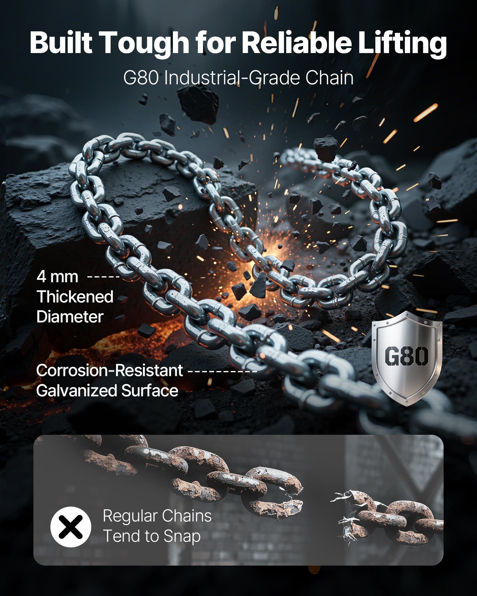 • G80 Industrial-Grade Chain: The chain hoist comes with 20 Ft / 6 m G80 alloy chain, 4 mm thick, galvanized for corrosion-resistance. Strong and sturdy for harsh work, ensuring reliable lifting in construction, warehouses, and industrial tasks