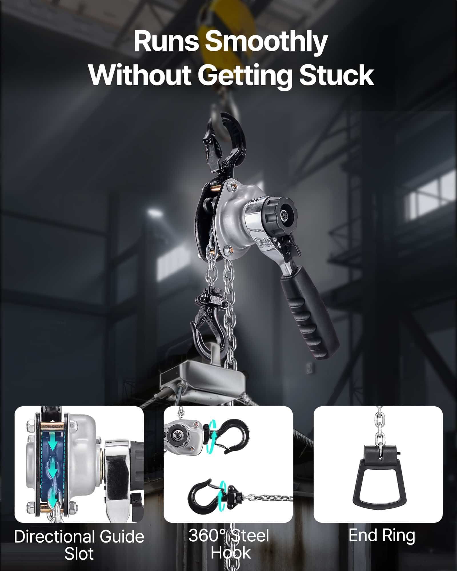 • Smooth Operation: This chain fall hoist includes an upgraded guided slot for smooth lifting without jamming. 360° swivel hook allows secure multi-angle use, avoiding twisting and increasing efficiency for tough lifting applications