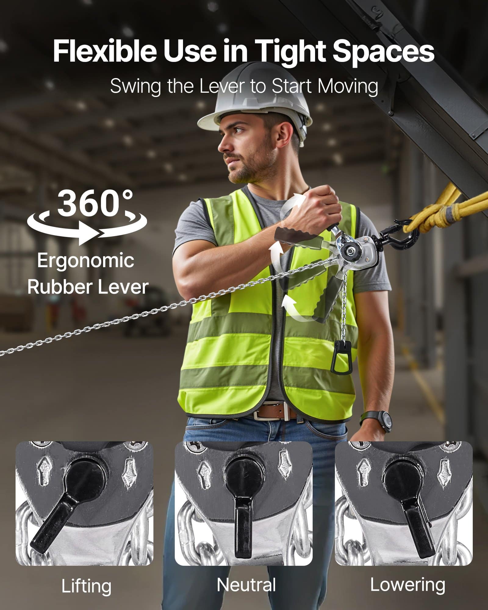 • Easy Operation: Our lever chain hoist includes a 360° rotating ergonomic handle with non-slip grip. Heavy loads can be shifted with minimal effort, for confined work areas. A three-position selector can switch between lifting, neutral, and lowering modes