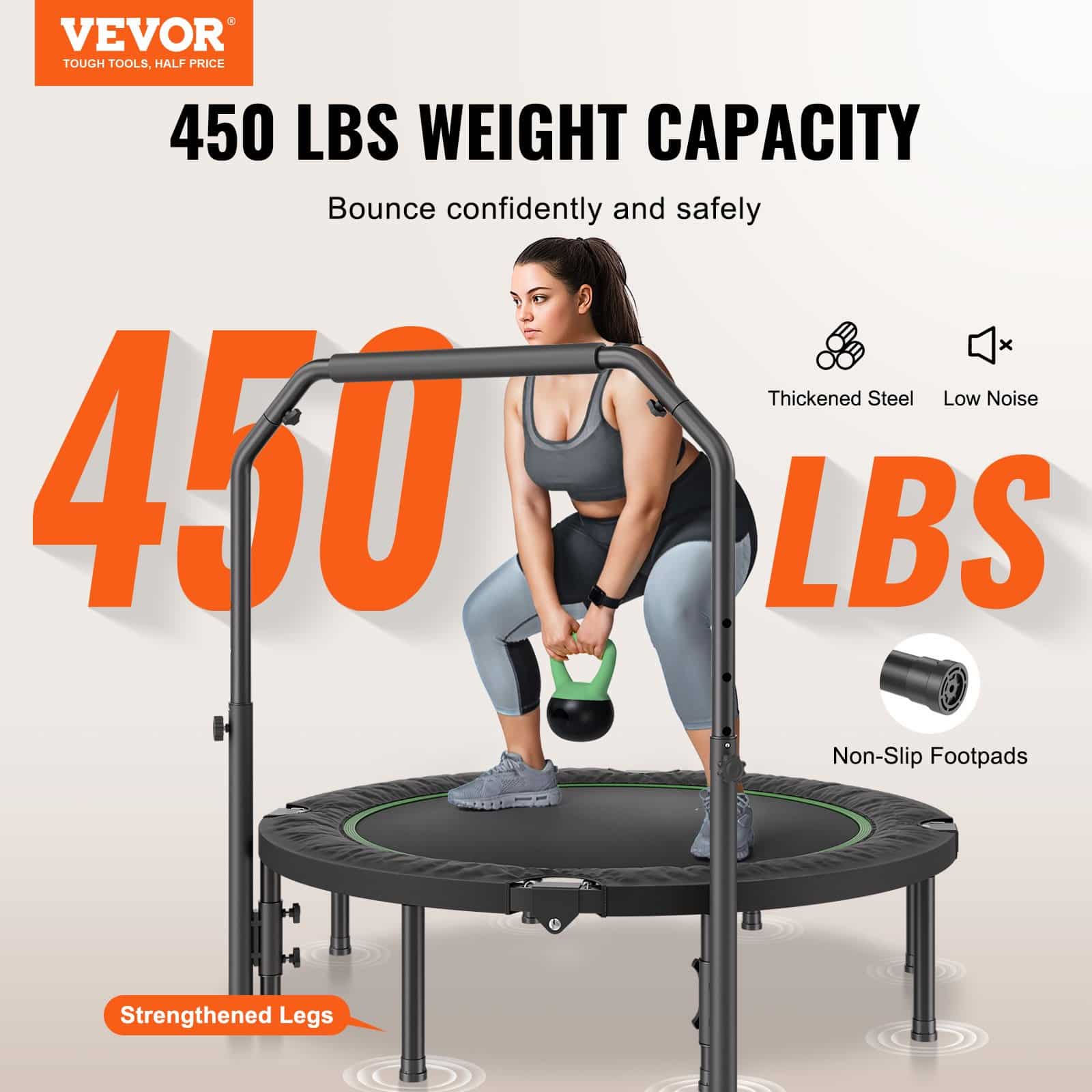 VEVOR Foldable Mini Trampoline, 52 Inch Fitness Rebounder, Max Load 450lbs Exercise Trampoline, Stable & Quiet Trampoline with 4 Level Height Adjustable Foam Handle, for Adults Indoor/Garden Workout