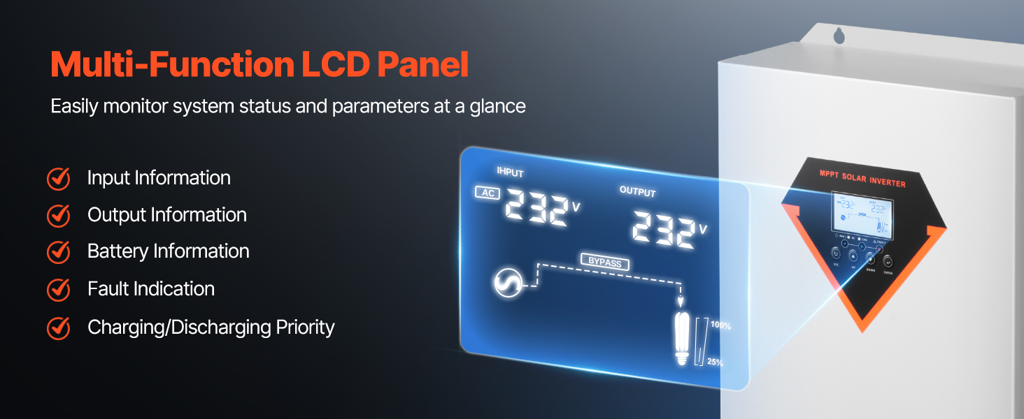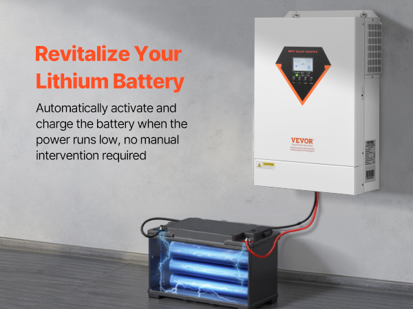 Our 2-in-1 hybrid solar inverter controller delivers a 6000W pure sine wave output and boasts an impressive 12000VA peak performance. Advanced MPPT technology achieves up to 94% conversion efficiency. Compatible with lithium, lead-acid, and LiFePO4 batteries, it has lithium activation function.