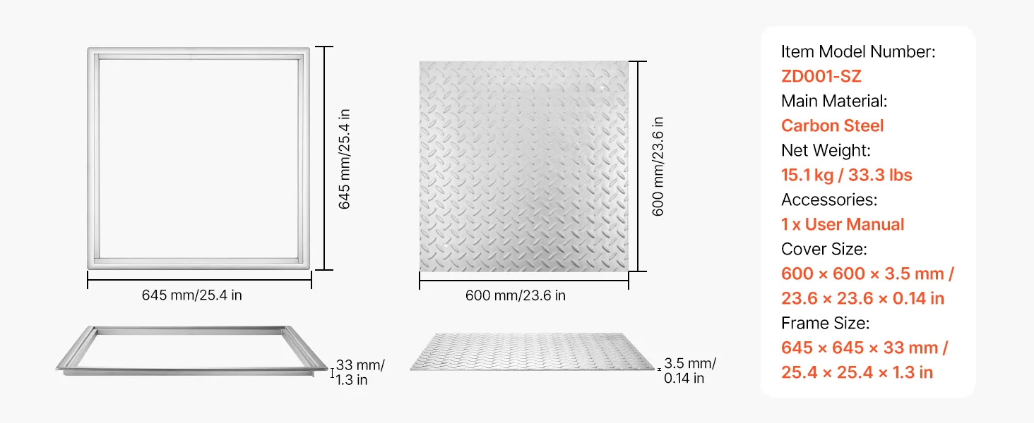 • Heavy-Duty Build: Cover Size: 600 x 600mm, Frame Size: 645 x 645mm. This manhole cover with frame provides standard coverage for inspection openings, featuring a solid construction that ensures secure installation and long-term stability