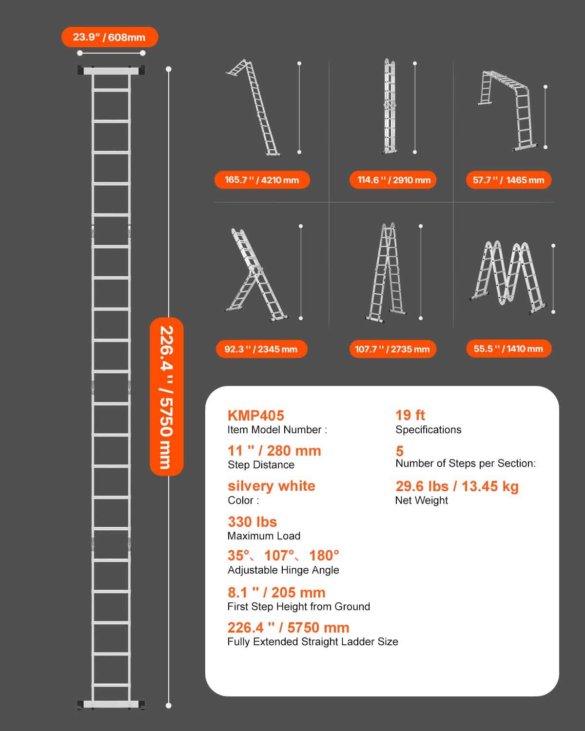 VEVOR daudzfunkcionālas saliekamās kāpnes, 7-in-1 augstas pagarinājuma pakāpienu kāpnes, rāmja 5 pakāpju teleskopiskās kāpnes, 19 pēdu augstuma lieljaudas regulējamas kāpnes, 330 mārciņas ietilpība mājas āra metālam
