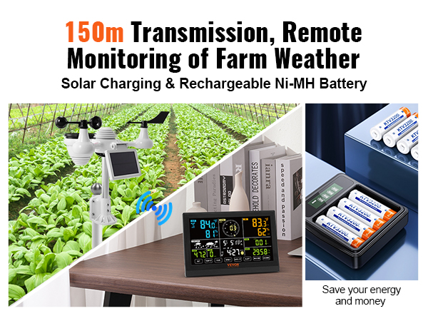 The solar-powered weather station has a 7-in-1 sensor that monitors wind speed, temperature and humidity, rainfall, etc. It transmits weather data in real time via a Wi-Fi connection, while the solar panel and Ni-MH battery provide long-lasting power. Get ready for any weather with the VEVOR!