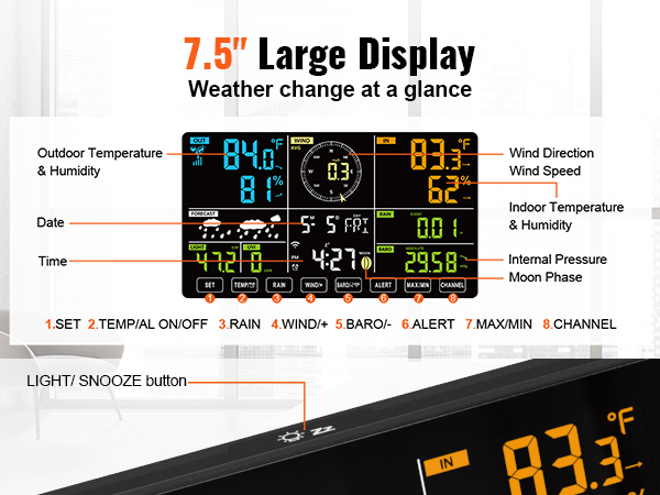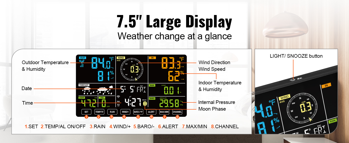 The solar-powered weather station is built with a 7.5-inch large screen, displaying weather forecasts and meteorological data more clearly. It comes with a 4-level backlight brightness to adapt to different environments during the day and night.