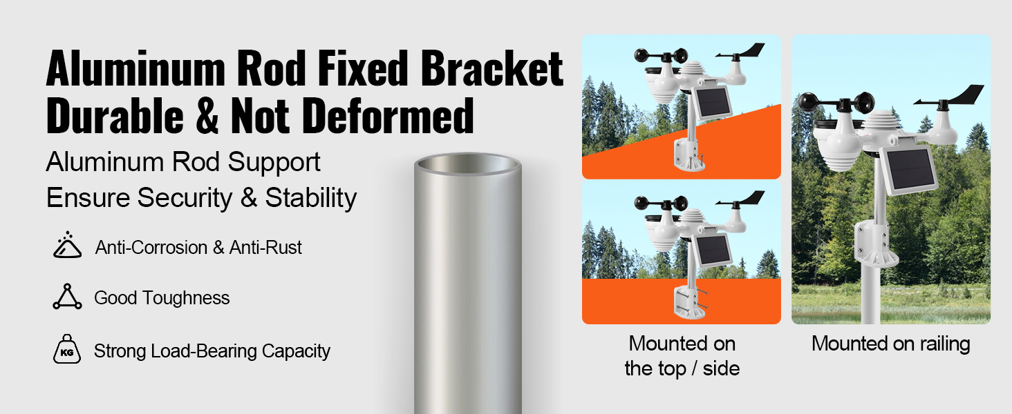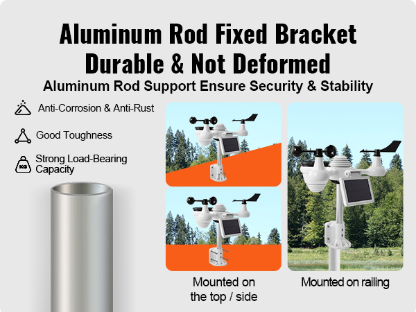 Our indoor outdoor digital weather station is equipped with an aluminum rod fixed bracket, which is anti-corrosion and rust-proof, fearless of harsh environments. It has a strong load-bearing capacity and is stable for mounting on the top, side, or on the railing.