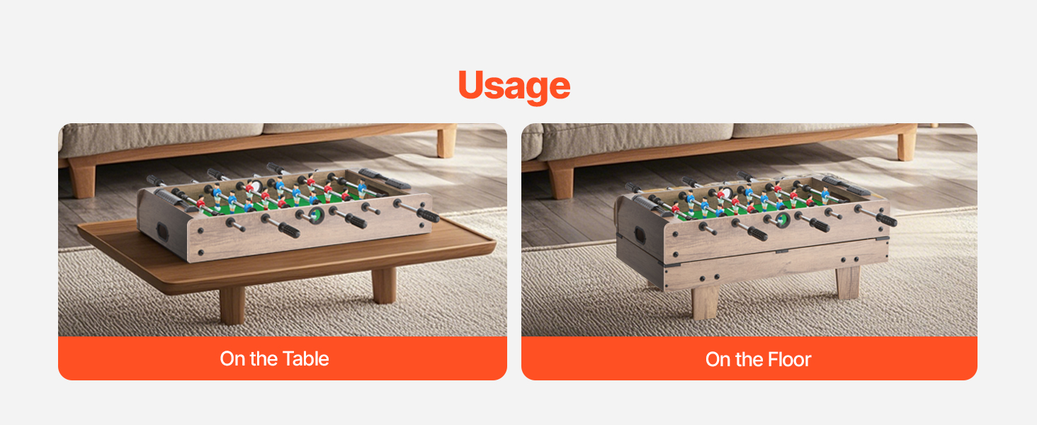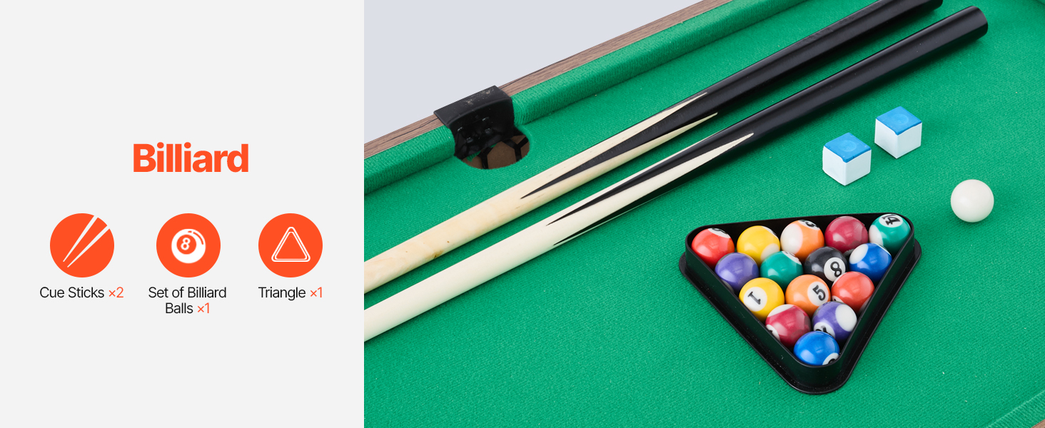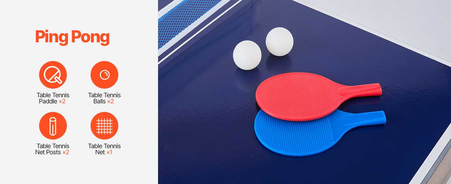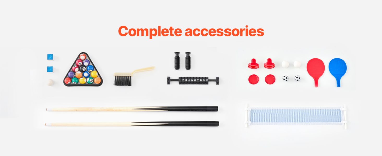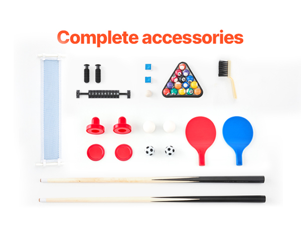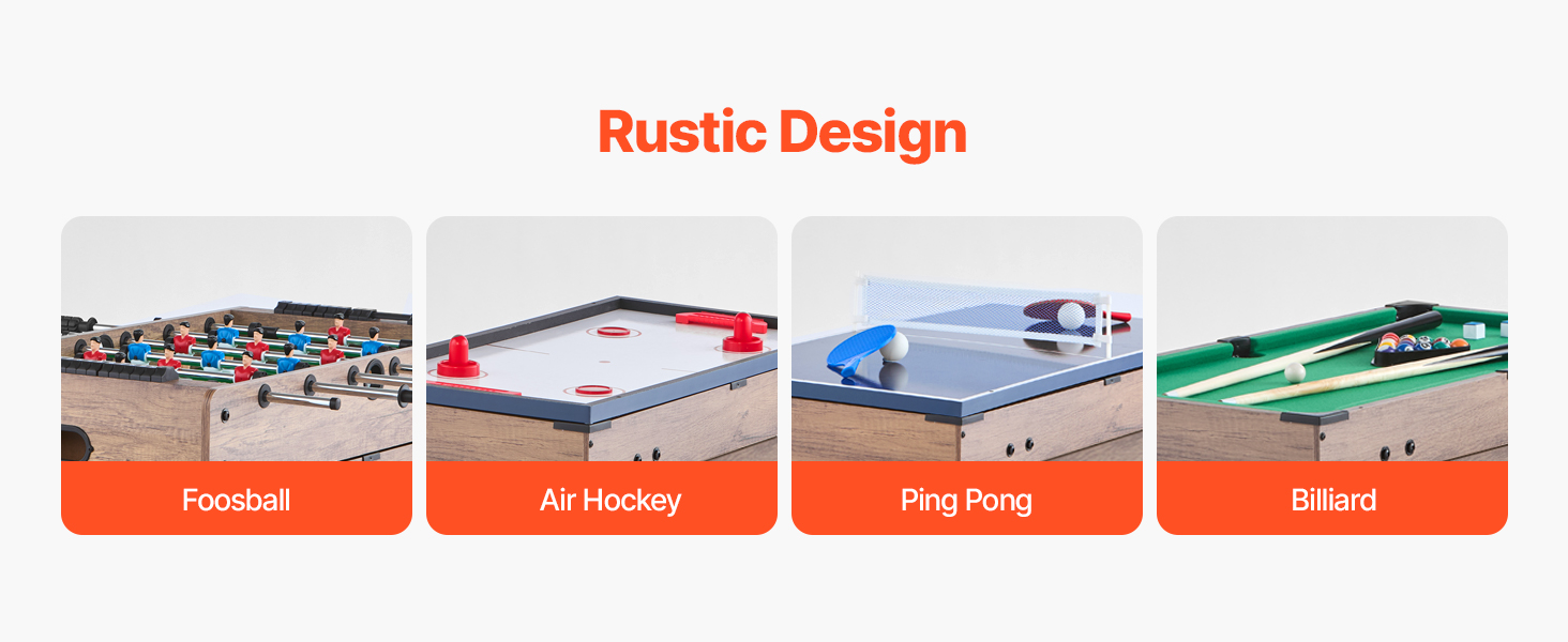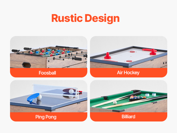 Šis 4-vienā daudzfunkcionālais spēļu galds apvieno gaisa hokeju, galda futbolu, biljardu un galda tenisu vienā pieejamā spēļu galdā, kas paredzēts stundām ilgai ģimenes izklaidei. Tā kompaktais dizains (32,3x16,9x13,8 collas / 82x43x35 cm) ar sakraujamu dizainu bez piepūles ietaupa vietu.