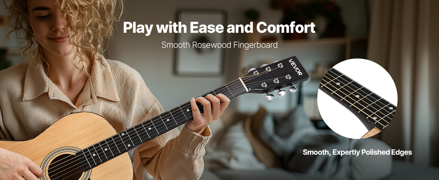 Mūsu akustiskajai ģitārai ir gluds rožkoka grifs, kas nodrošina ērtu spēlēšanas pieredzi un uzlabotu baudījumu.