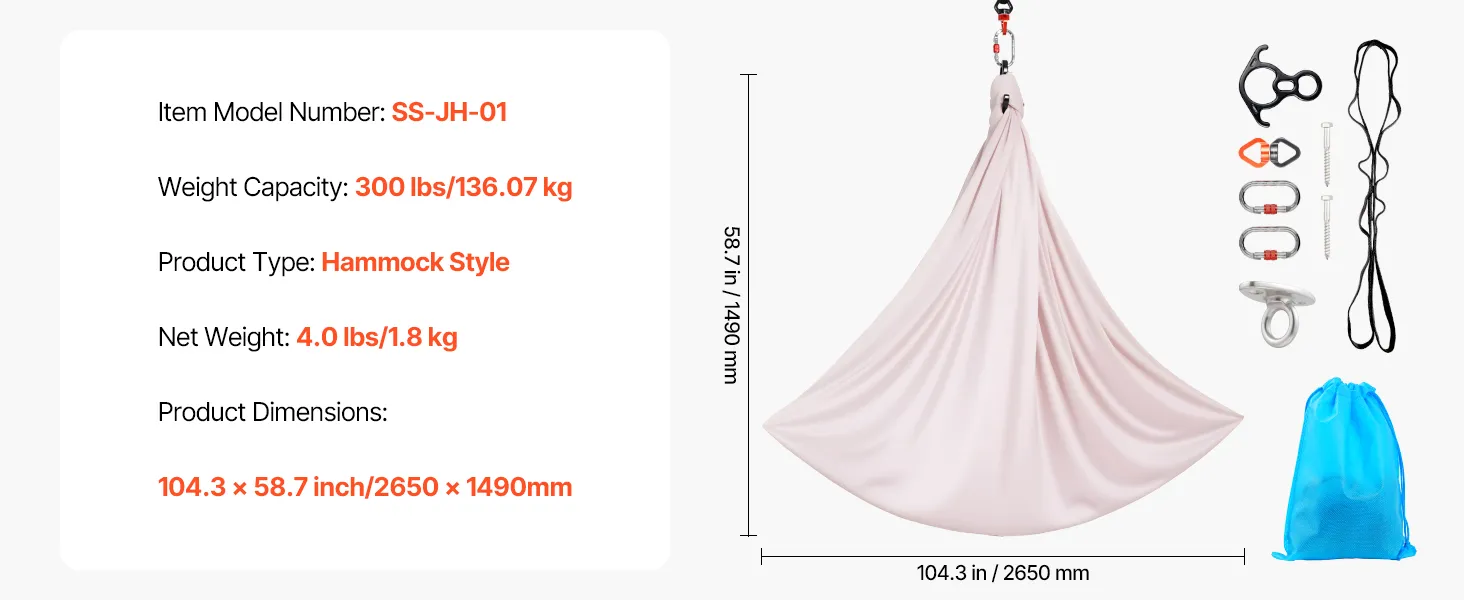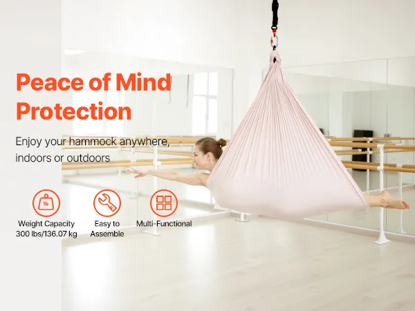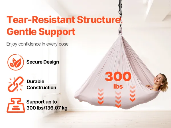 Featuring strong steel carabiners and chains, this silk aerial yoga swing supports 300 lbs/136.07kg and lets you glide through yoga movements. Wide layout accommodates all body types, while the thoughtfully designed frame enhances comfort, freedom, and a smooth, enjoyable practice experience.