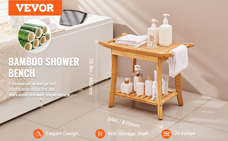 VEVOR Bamboo Shower Bench, 24 x 13.8 x 18.9 in, Waterproof Shower Stool Chair with Storage Shelf Handle, 300 lbs Load Capacity Spa Bath Seat Organizer, for Adults Seniors Women Elderly Indoor Outdoor