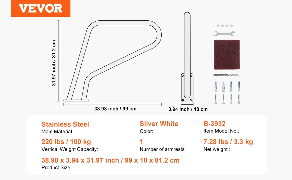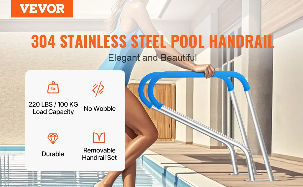 VEVOR Pool Handrail, 39 x 32 inch Pool Railing, Stainless Steel with Base Plate for Indoor/Outdoor Pools,Swimming Pool Safety Railing for Decks,Rust-Proof Grab Bar w/ Grip Cover&Accessories for Spas