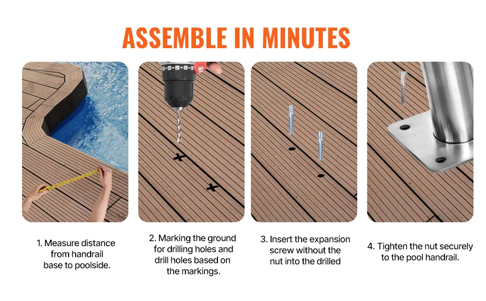 Mūsu baseina margas ir saderīgas ar dažādiem virsmas materiāliem, tostarp betonu, koku un flīzēm, nodrošinot ātru uzstādīšanu. Lai izveidotu drošas un izturīgas āra margas, nav nepieciešami sarežģīti instrumenti.