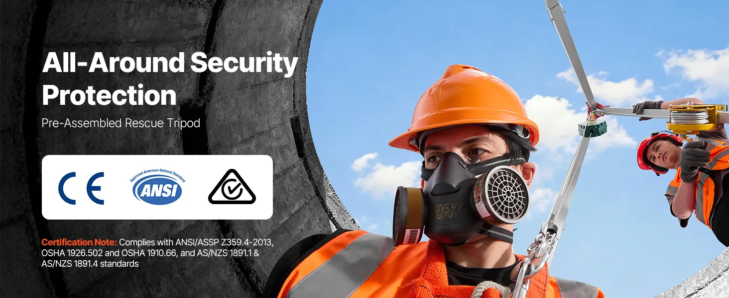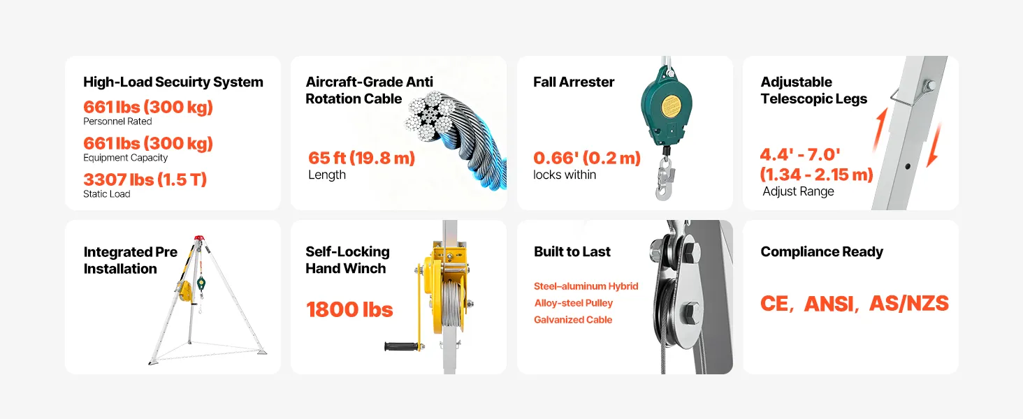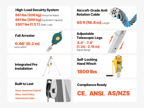 Our confined space rescue tripod is CE, ANSI & AS/NZS compliant. It supports up to 661 lb for personnel and delivers 3,307 lb static load capacity, giving your team dependable performance on critical lifts.