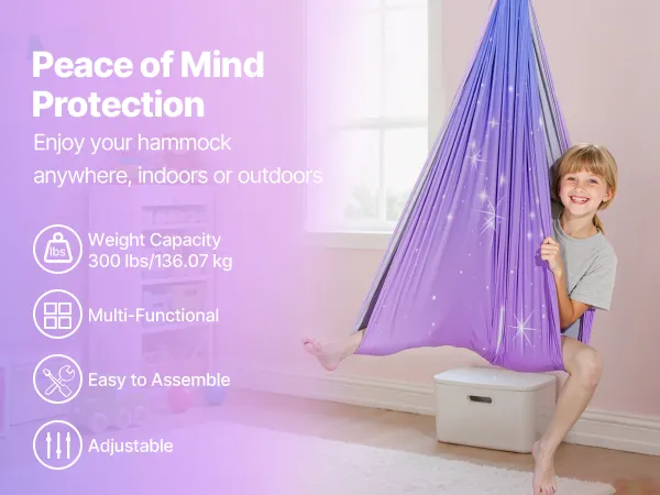 Our therapy cuddle swing includes essential hardware like steel carabiners and daisy chains, making it easy to transition between hammock and swing modes. Customize your aerial yoga flow and enjoy diverse movements with the comfortable setup.