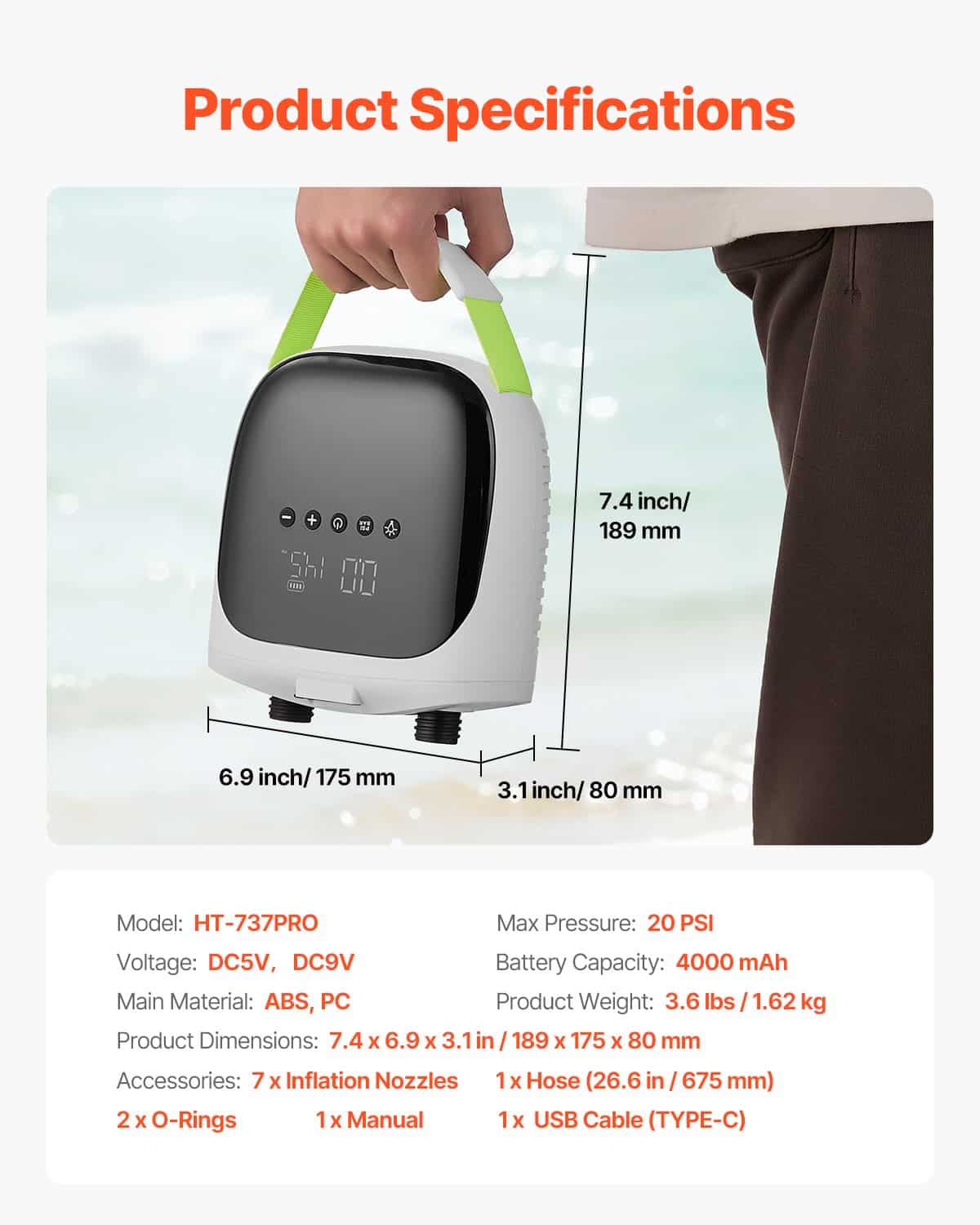 Šis elektriskais SUP dēļa pumpis, kas paredzēts āra aktivitāšu entuziastiem, piepūšas līdz 12 PSI (9,5 pēdām) 9 minūtēs. Tam ir digitālais displejs, atmiņas funkcija un 4000 mAh akumulators lietošanai bezsaistē, un tas viss vieglajā konstrukcijā, kas ir ideāli piemērota kempingam un ceļojumiem.
