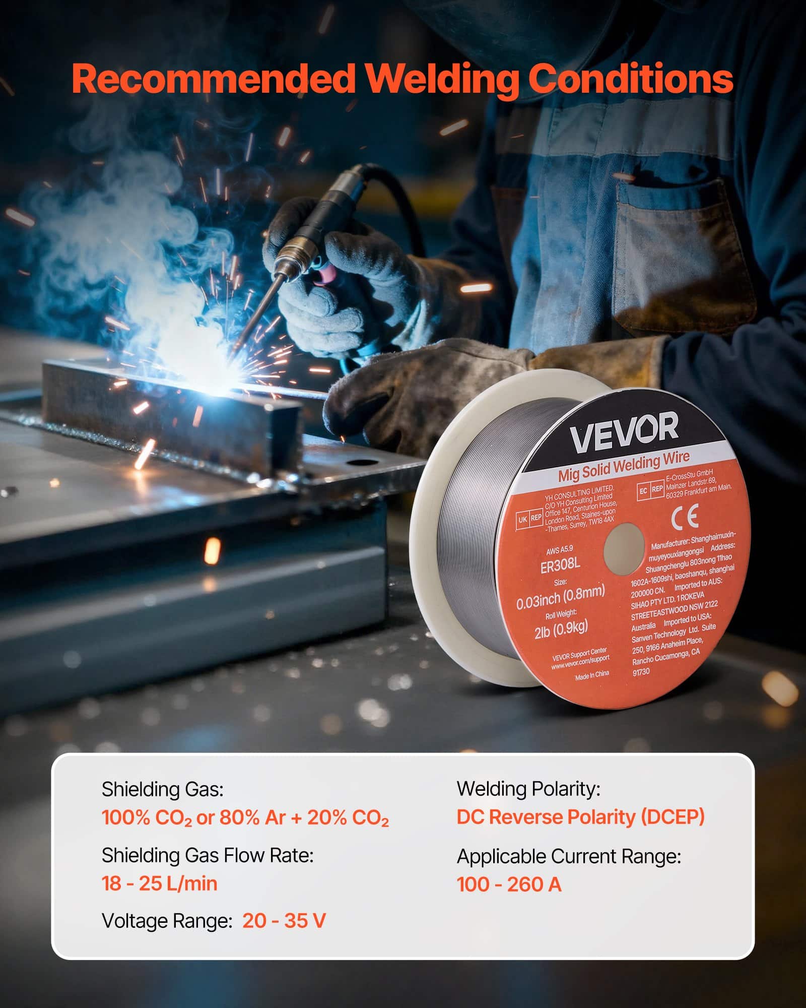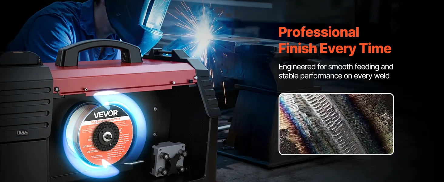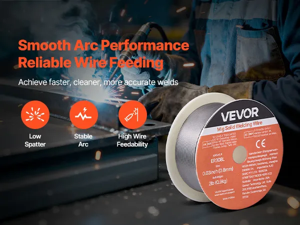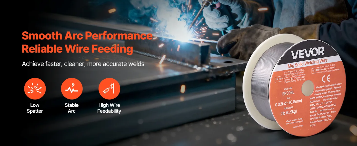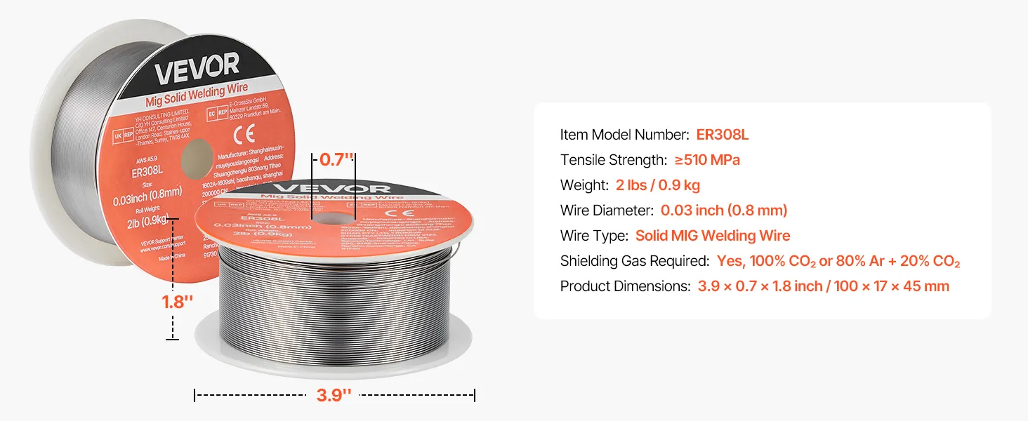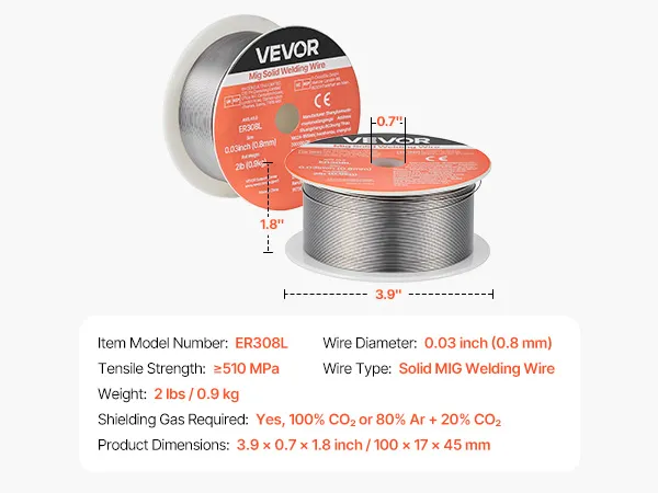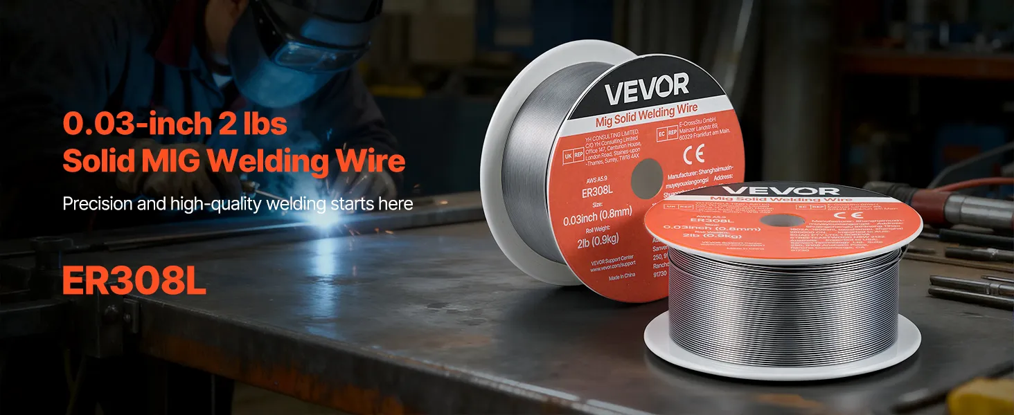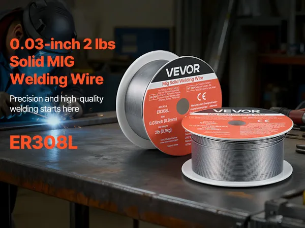 VEVOR 0.03" 2 lbs ER308L solid MIG welding wire delivers strong, consistent welds with smooth wire feeding, low spatter, and stable arc action. Supports all-position welding and high tensile strength for reliable performance in automotive, machinery, and DIY welding projects.