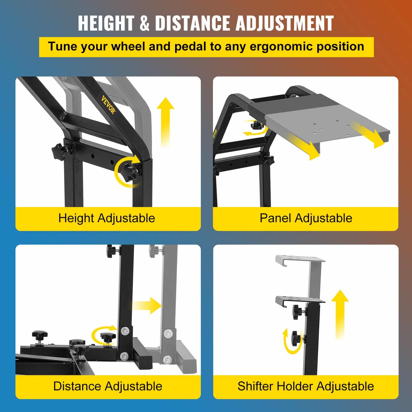 The steering wheel stand is adjustable in distance and height (20.47"-26.77" / 52-68 cm), allowing players of different sizes to use it. In addition, you can tune the wheel and shifter to any ergonomic position.