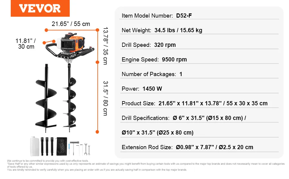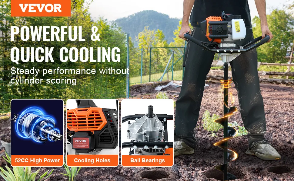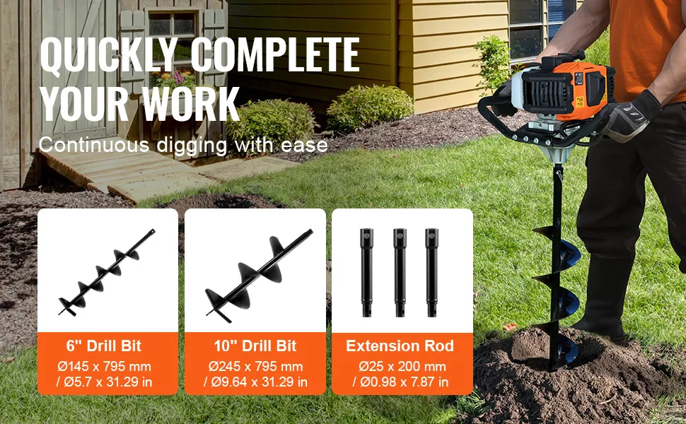 VEVOR Post Hole Digger Gas Powered, 52CC 1450W Earth Auger, Gas Auger with 6” & 10” Auger Drill Action Design Bits & 3 Extension Rods, Post Fence Hole Digger for Farmland Garden Plant, Orange+Black