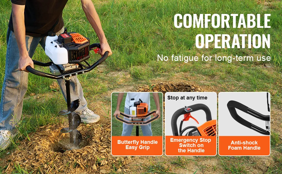Vibrāciju slāpējošais putu rokturis nodrošina komfortu darbības laikā, avārijas apturēšanas slēdzis uz roktura garantē drošību un vieglu izslēgšanu jebkurā laikā, un tauriņa formas rokturis ir izstrādāts tā, lai to būtu viegli satvert ilgstošas darba stundas.