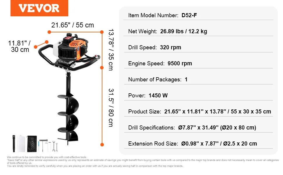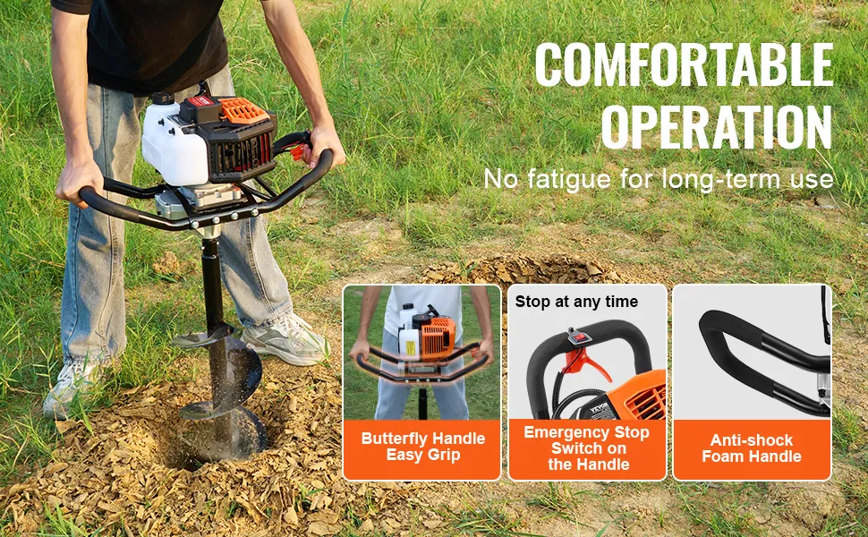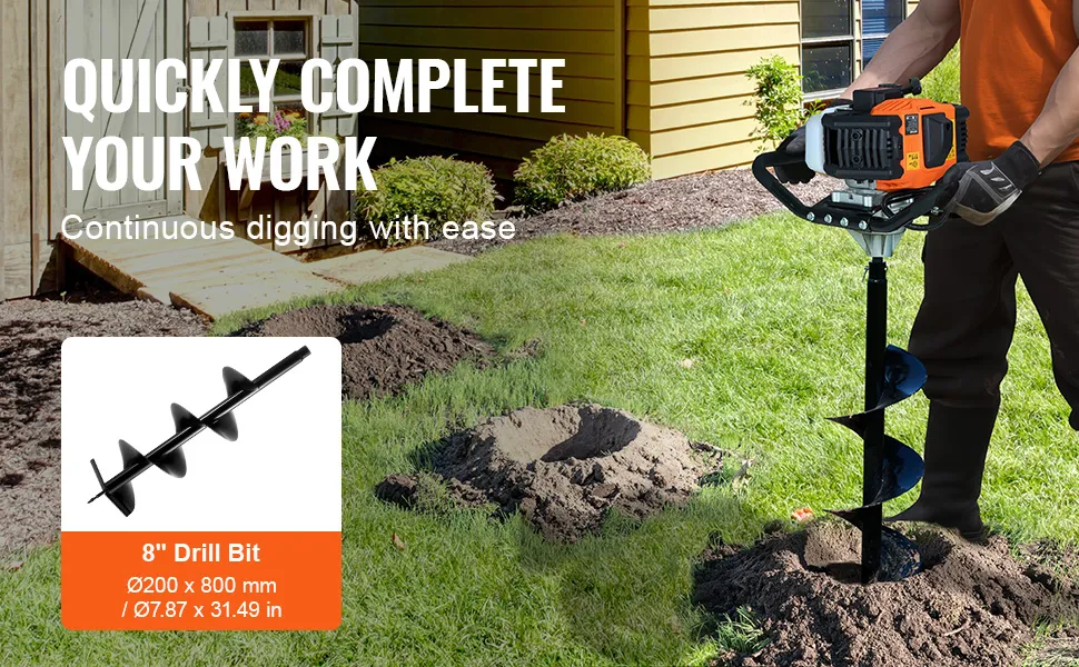 VEVOR Post Hole Digger Gas Powered, 52CC 1450W Earth Auger, Gas Auger with 8” Auger Drill Action Design Bits & 1 Extension Rod, Post Fence Hole Digger for Farmland Garden Plant, Orange+Black
