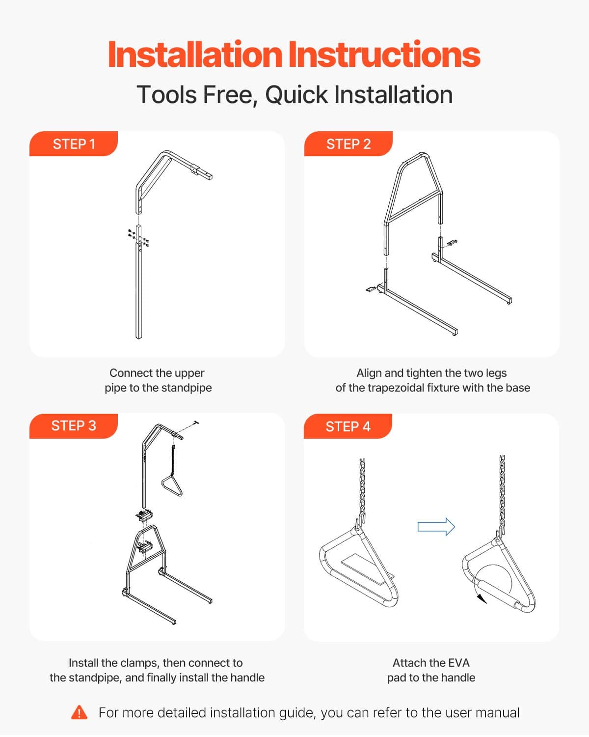 Šis brīvi stāvošais trapeces stienis ir aprīkots ar montāžas furnitūru un ir viegli uzstādāms, neprasot sarežģītus instrumentus. To var bez piepūles uzstādīt, lai nodrošinātu spēcīgu un uzticamu atbalstu, atvieglojot ikdienas mobilitāti un uzlabojot dzīves kvalitāti.