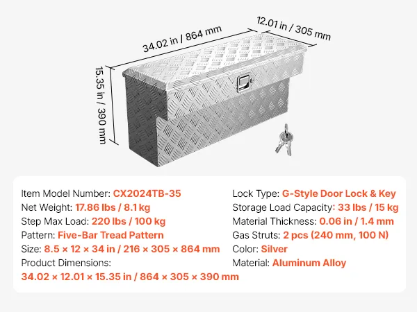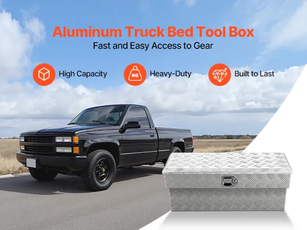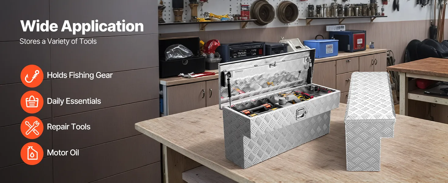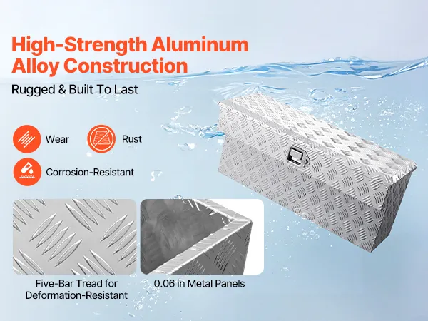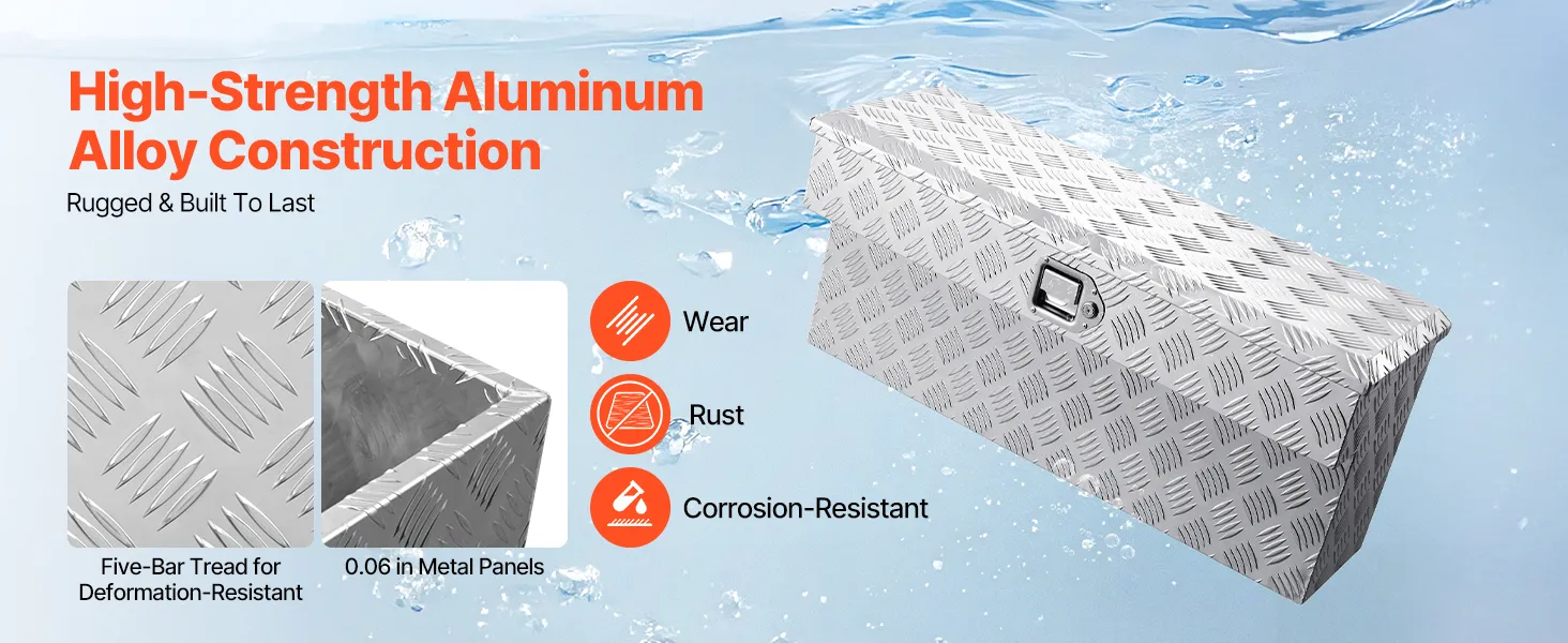 Constructed from 0.06 in / 1.4 mm thick reinforced metal panels and a high-strength aluminum alloy frame with tread patterns, this truck toolbox provides excellent wear-, rust-, and corrosion-resistance, ensuring long-lasting use.