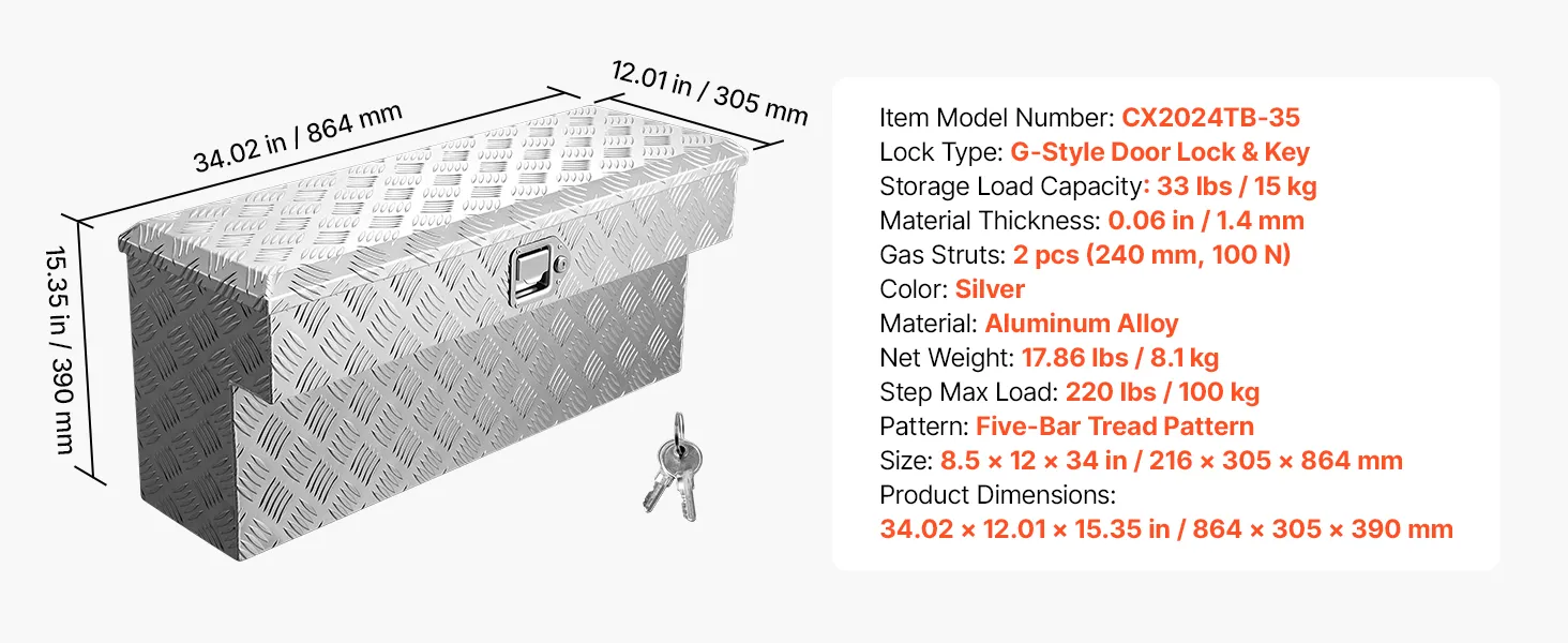 This truck tool box features a full aluminum frame with 2.64 cu ft (75 L) of storage space and a step platform supporting up to 220 lbs / 100 kg. Mounted on the side of your truck, it allows quick and easy access to tools and items without entering the cab.