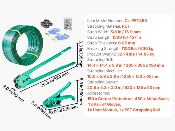 Our strapping kit includes 1 strapping tensioner, 1 heavy-duty strapping sealer, 450 metal seals, 150 corner protectors, 1 pair of gloves, and 1 roll of PET strapping band. The strapping band is 1500 ft/457 m, providing ample usage. This complete strapping tool set meets your daily packaging needs!