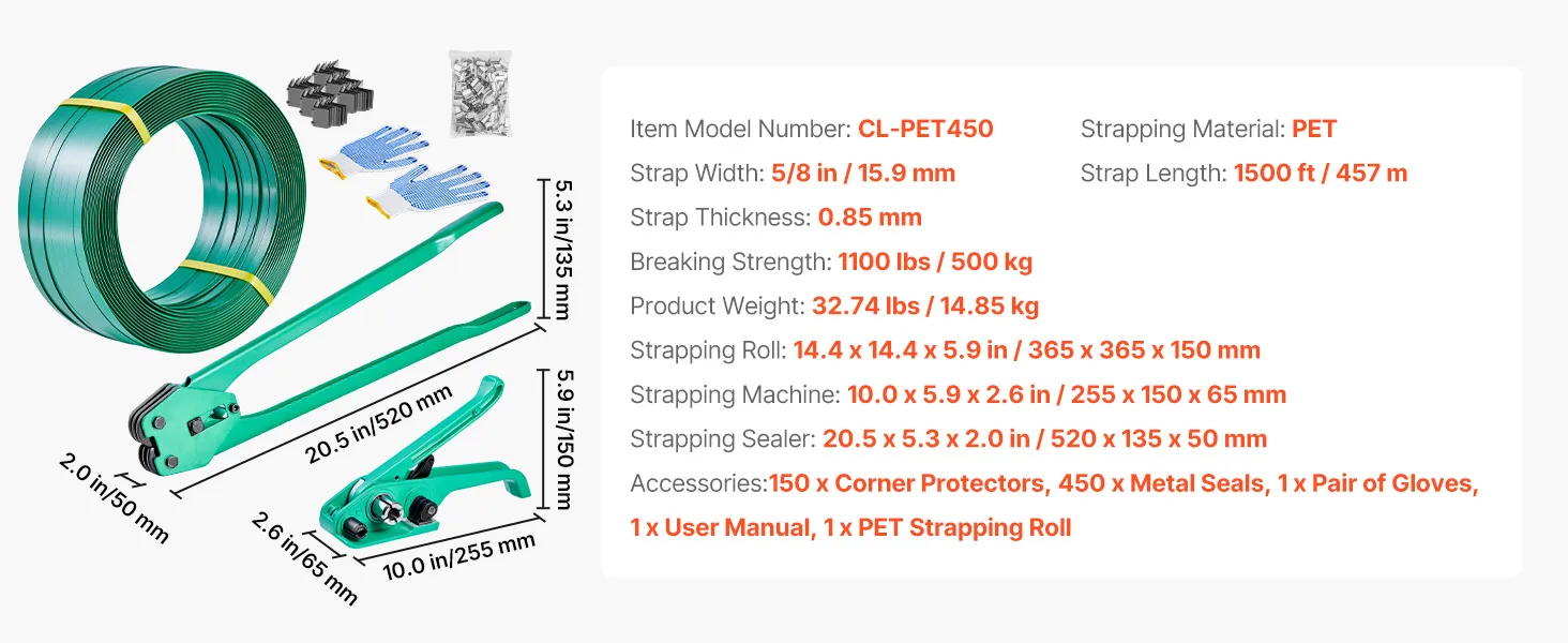 VEVOR Banding Strapping Kit, Heavy Duty Banding Sealer Tool with 457m PET Band, 450 Metal Seals, 150 Corner Protectors & Gloves, Plastic Pallet Packaging Strapping Kit for Warehouse/Shipping/Moving