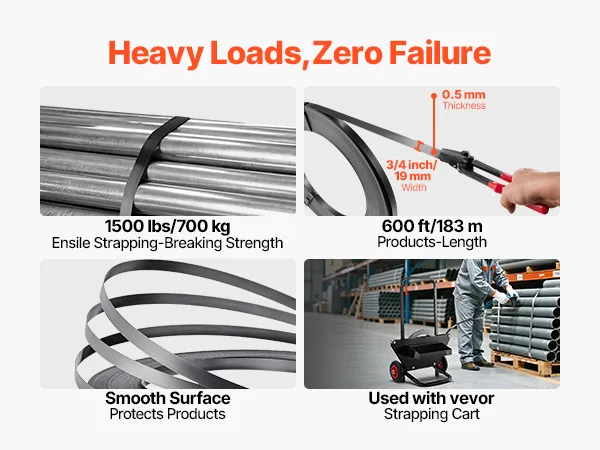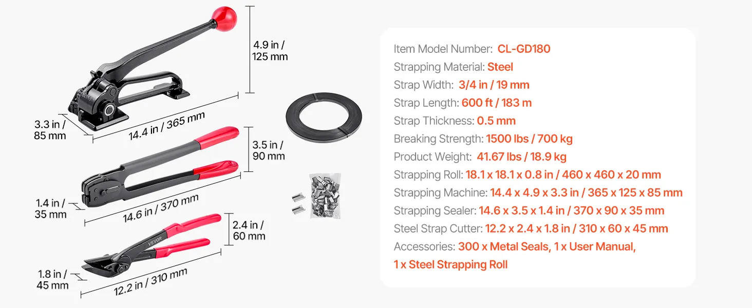 VEVOR Steel Banding Strapping Kit, Heavy Duty Banding Sealer Tool with 183 m Binding Straps, 300 Metal Seals, Manual Pallet Packaging Strapping Kit for Warehouse, Transportation, Industrial Bundling