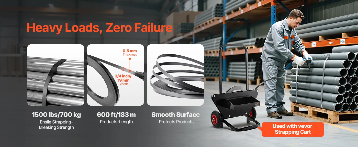 Designed for large quantities of heavy loads, it integrates tensioning, sealing, and cutting functions. Suitable for heavy-duty scenarios such as heavy metal parts in factory workshops, our banding strapping kit can efficiently complete the stable strapping of heavy cargo.