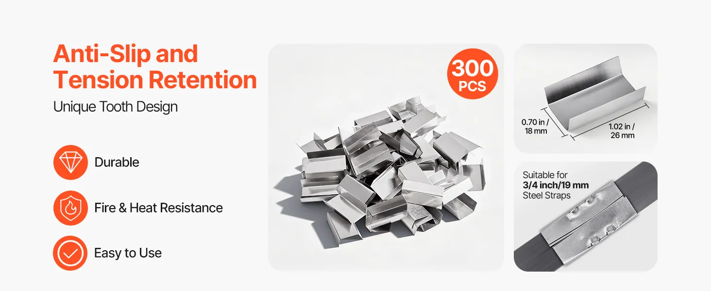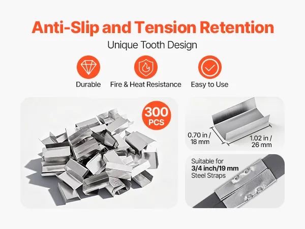 Long-lasting anti-slip locking force is achieved through a unique tooth pattern. The seals form firmly and can lock the steel strapping tightly, making each strapping stable and reliable. From warehousing and logistics to engineering sites, it is a practical tool to improve strapping efficiency.