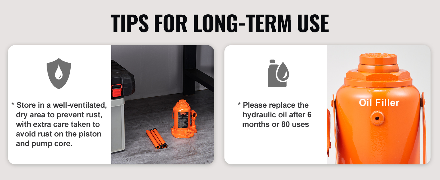 Kad hidrauliskais pudeles domkrats netiek lietots, uzglabājiet to tīrā un sausā vidē, prom no pārmērīga karstuma vai kodīgām vielām. Pareiza eļļošana ir ļoti svarīga netraucētai darbībai. Periodiski ieeļļojiet domkratu ar piemērotu smērvielu.