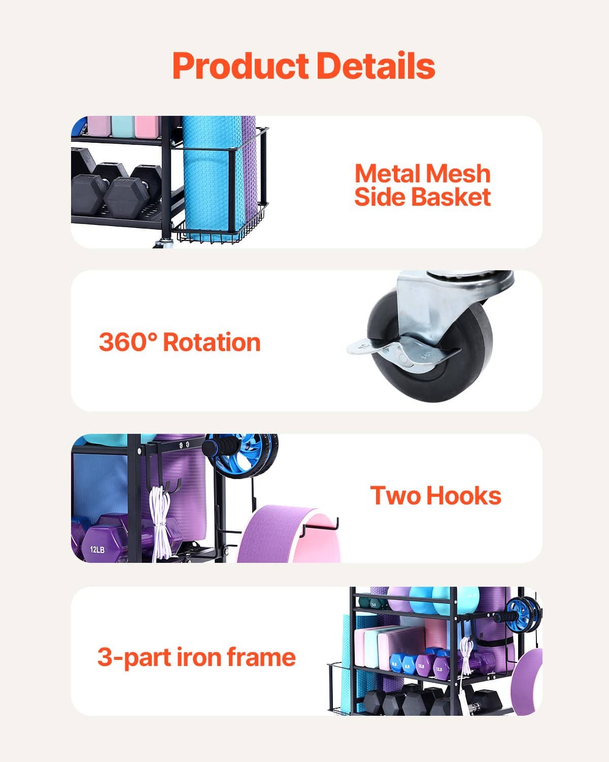Ar dažādām uzglabāšanas vietām un metodēm šis jogas paklājiņa turētājs maksimāli palielina jūsu treniņu aprīkojuma uzglabāšanas ietilpību, atvieglojot piekļuvi priekšmetiem apakšā. Aprīkots ar četriem izturīgiem 360 grādu riteņiem (divi nofiksējami), tas atbilst jūsu mobilitātes un stabilitātes vajadzībām.