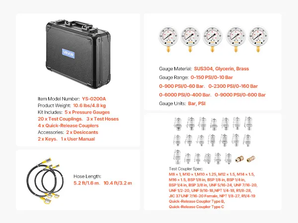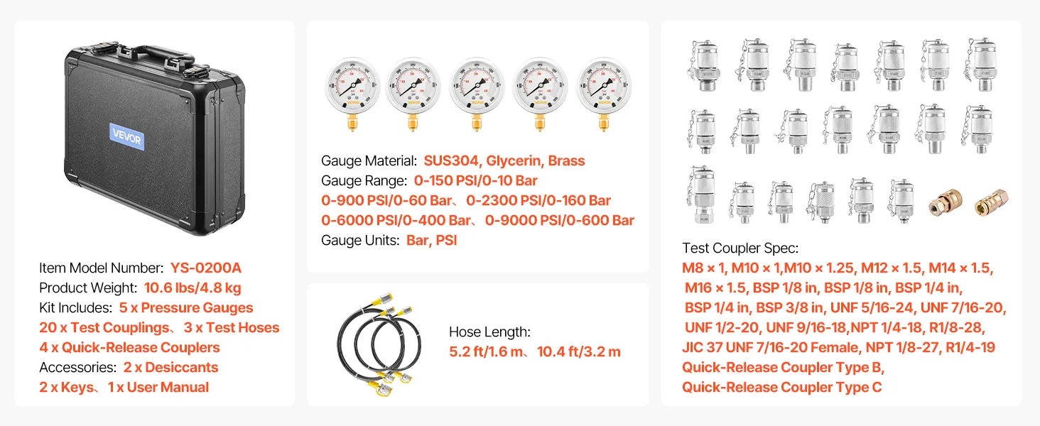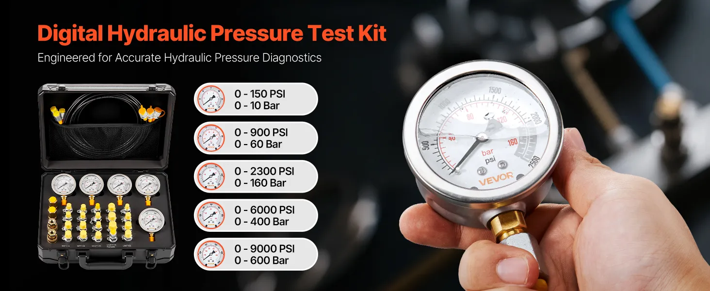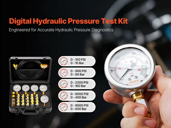 VEVOR Hydraulic Pressure Test Kit, 10/60/160/400/600 Bar (150/900/2300/6000/9000 PSI), Hydraulic Gauge Kit 5 Gauges 20 Couplings 4 Quick-Release Couplers 3 Hoses for Excavator Construction Machinery