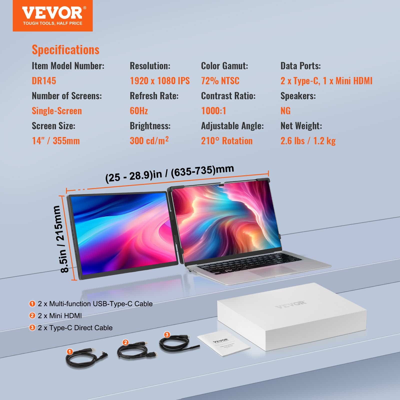 Komplektā ietilpst visi nepieciešamie piederumi: 1 mini HDMI kabelis, 1 daudzfunkcionāls USB C tipa kabelis un 1 C tipa tiešā savienojuma kabelis. VEVOR klēpjdatora ekrāna monitors, kas sver tikai 1,2 kg, nodrošina efektīvu darbu jebkur.