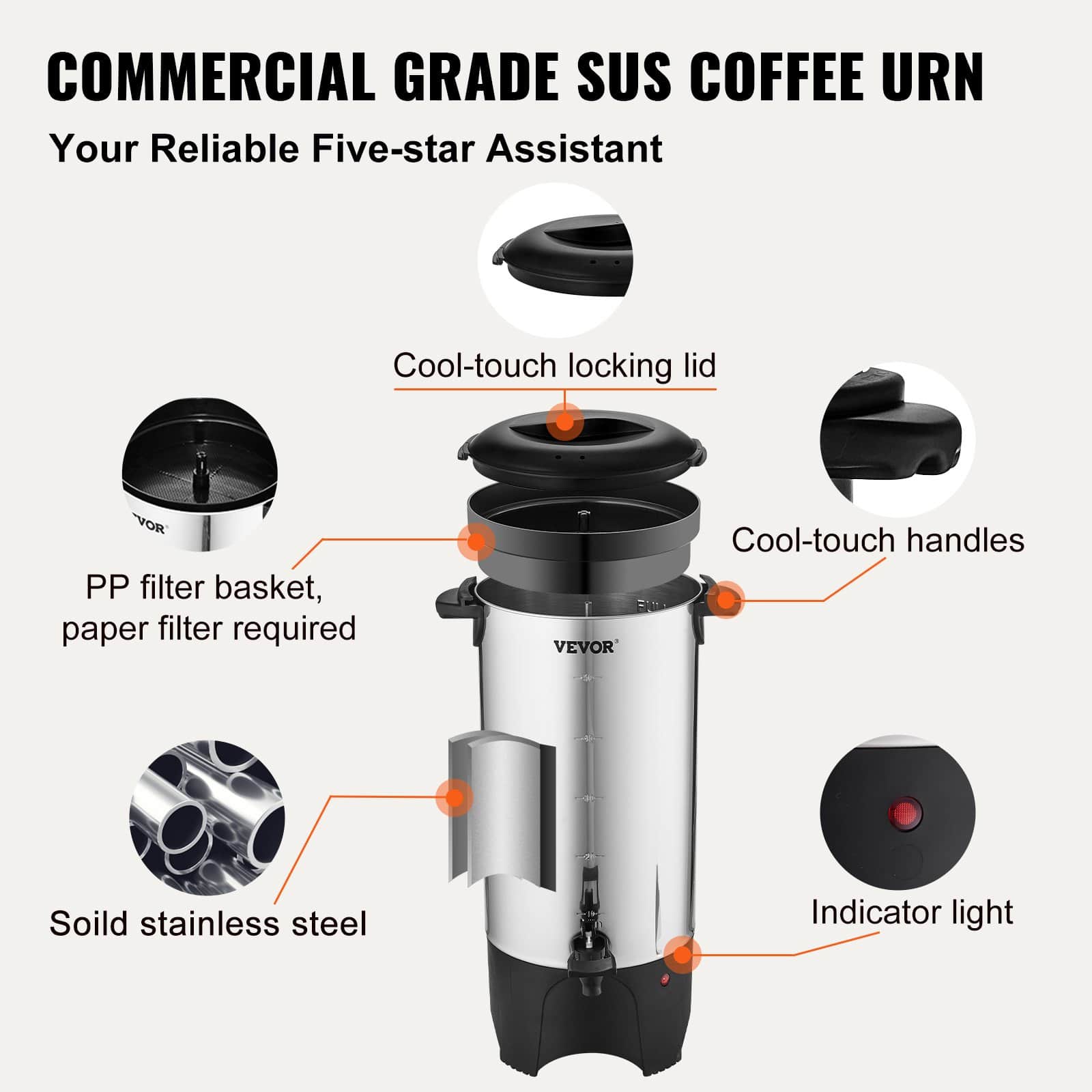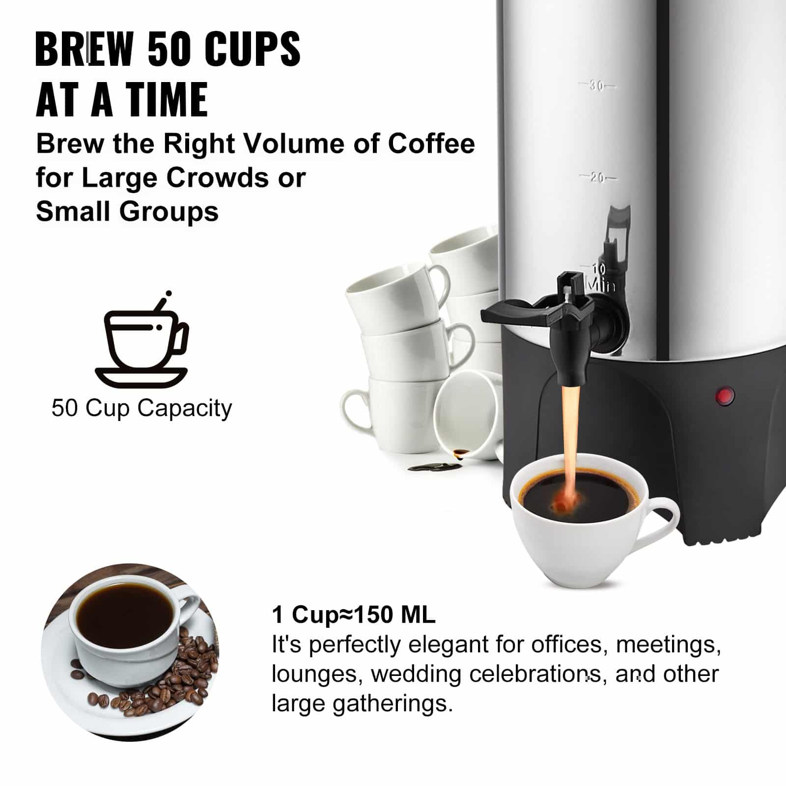VEVOR Commercial Coffee Urn, 50 Cups Stainless Steel Large Coffee Dispenser, 1000W 220V Electric Coffee Maker Urn For Quick Brewing, Hot Water Urn with Detachable Power Cord for Easy Cleaning, Silver