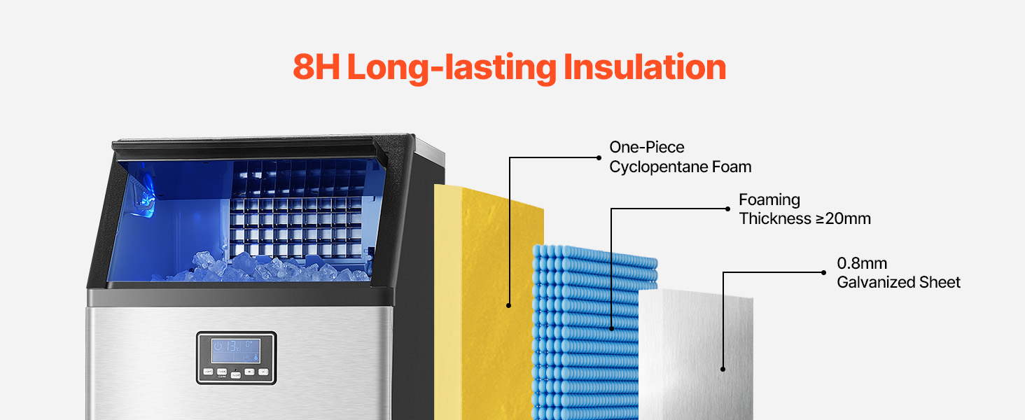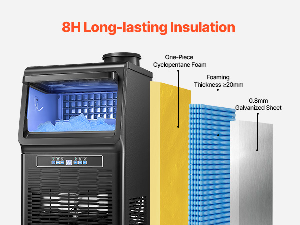 Mūsu komerciālais ledus automāts saražo 150 mārciņas ledus gabaliņu dienā, un 8 stundu izolācijas funkcija ļauj jums iegūt ledus gabaliņus, kad vien vēlaties.