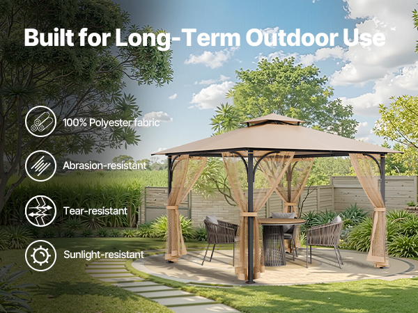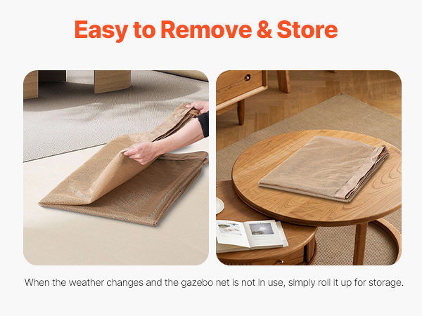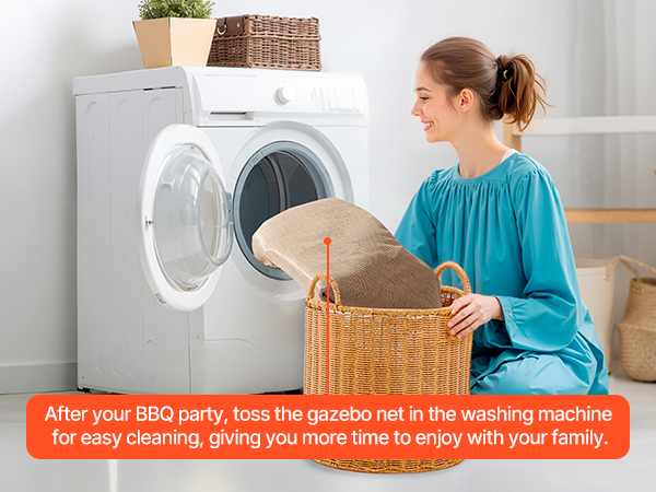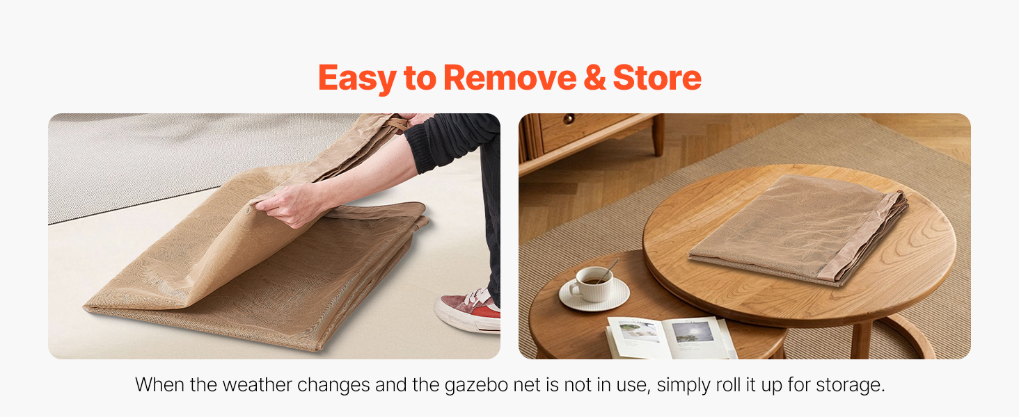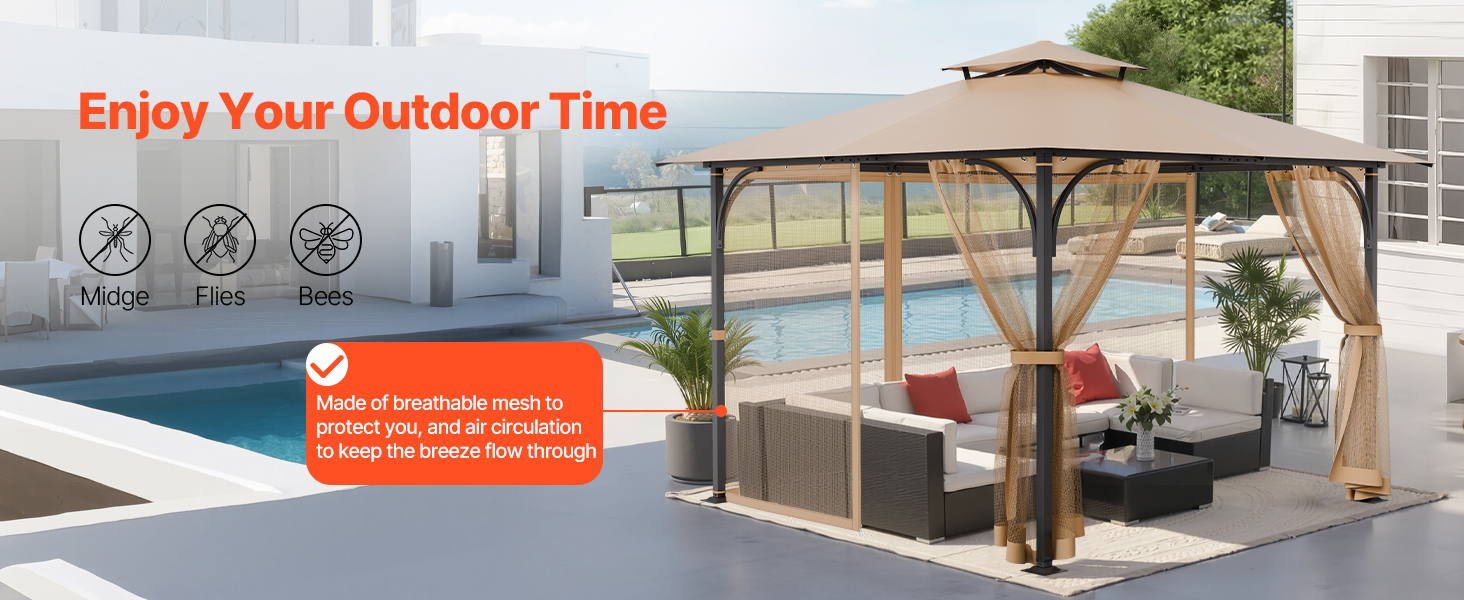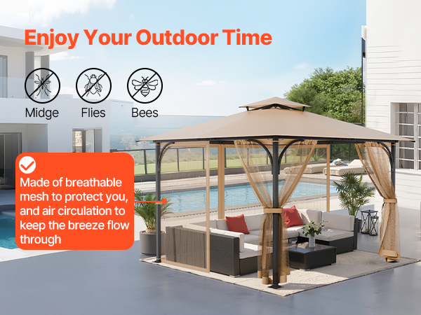 This gazebo net fit 10×10×7ft gazebos, made from tear-resistant 100% polyester. It effectively blocks midges and provides privacy. Equipped with aluminum fixing holes, hooks, and rings for secure attachment. Machine washable for easy cleaning and storage. The double-sided zipper for convenience.