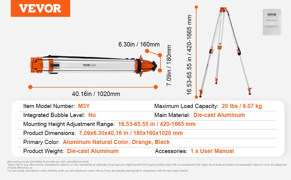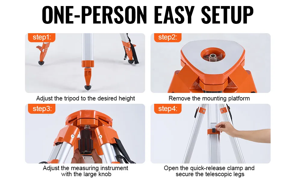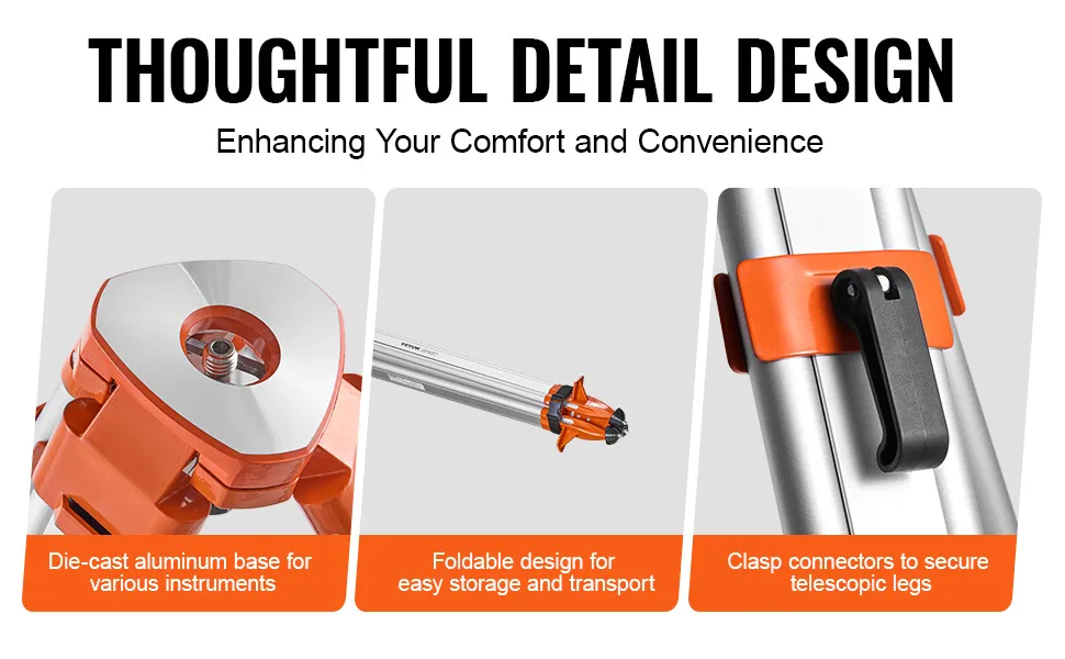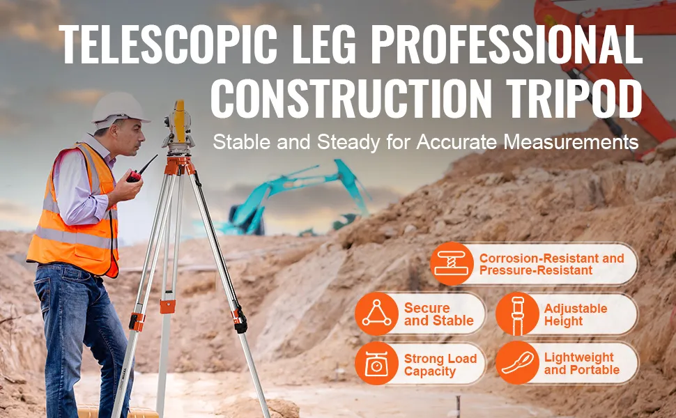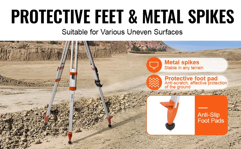 • Izturīgs un stabils: VEVOR statīvs ir izgatavots no 0,03 collu/0,8 mm alumīnija sakausējuma, kas nodrošina ilgstošu izturību un nodilumizturību. Lietā alumīnija pamatne atbalsta izturīgus instrumentus, piemēram, totālās stacijas, ar maksimālo kravnesību 12 mārciņas/5,44 kg.
