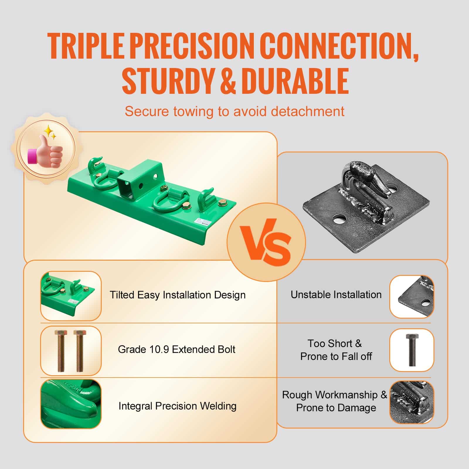 Traktora āķiem ir divkārša stiprināšanas sistēma, kas sastāv no skrūvēm un metināšanas, un tiem ir saliekts leņķis, lai nodrošinātu ciešu savienojumu ar piekabi, tādējādi nodrošinot stabilitāti un uzticamību vilkšanas laikā. Tā zaļā pulverkrāsojuma virsma uzlabo aizsardzību pret rūsu, pagarinot kalpošanas laiku.