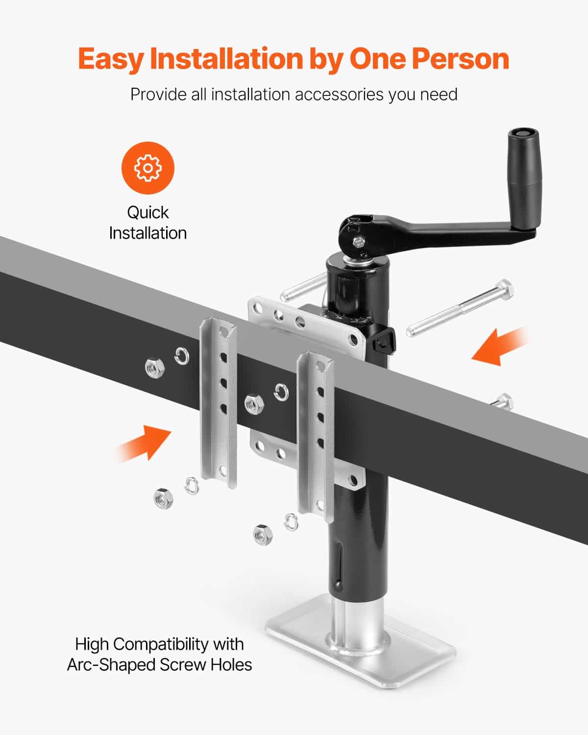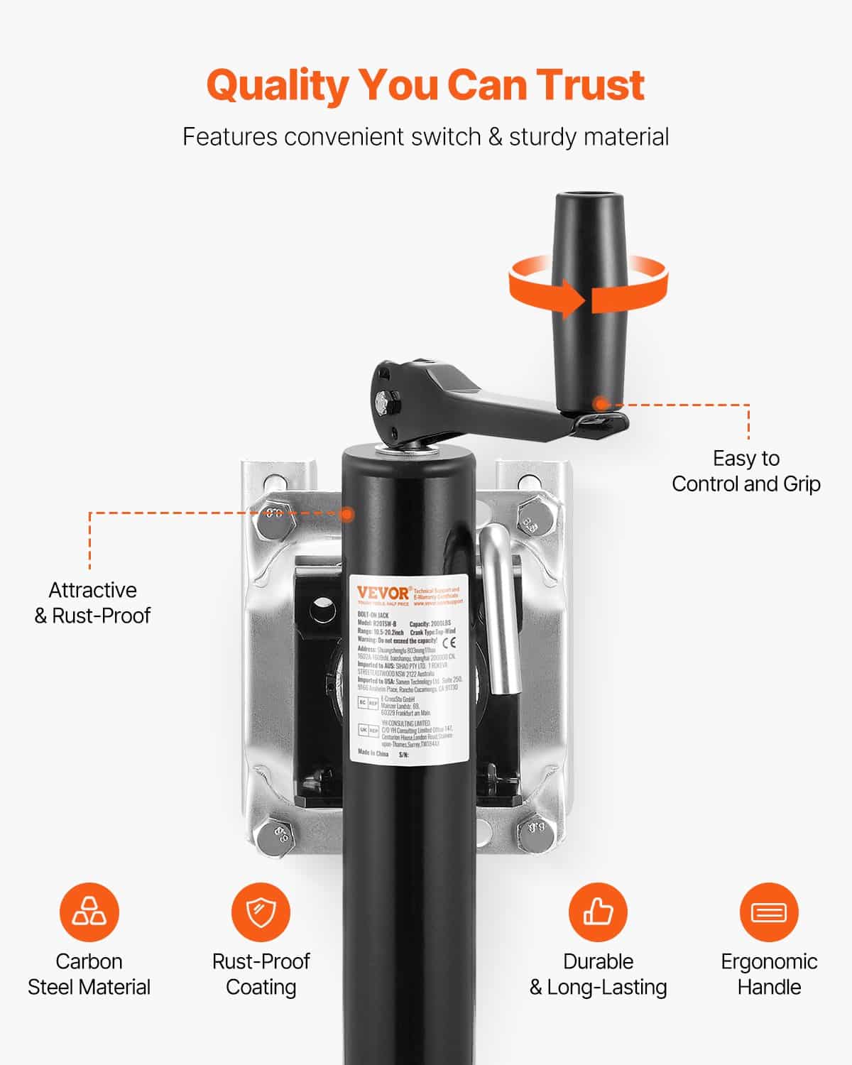 Mūsu piekabes domkratam ir spēcīga kravnesība un ergonomisks rokturis piekabes pacelšanai bez piepūles. Tas ir izgatavots no oglekļa tērauda materiāla un rūsas necaurlaidīga pārklājuma, nodrošinot tā ilgstošu lietošanu!
