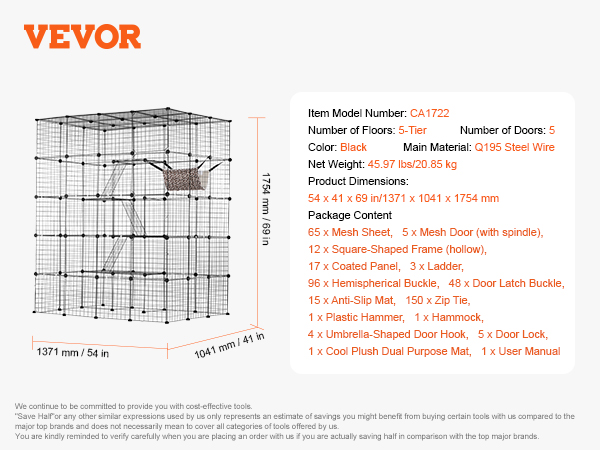 VEVOR Īpaši Liels 4-Līmeņu Kaķu Būris 142 x 104 x 175 cm (56 x 41 x 69 in) Izturīga Metāla Stiepļu Kaķu Voljērs ar Šūpuļtīklu un Aksesuāriem