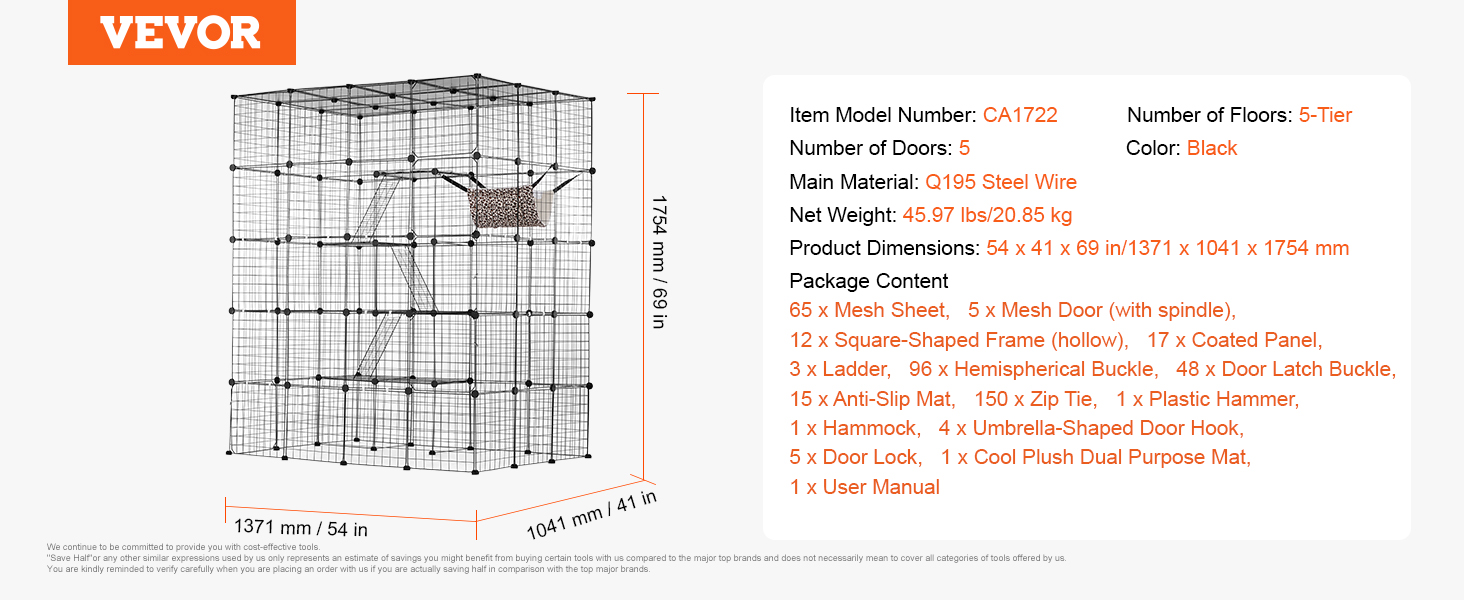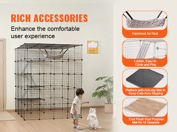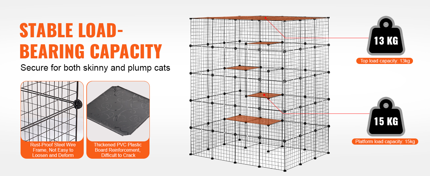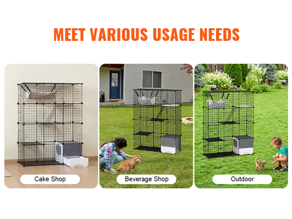 The 4-tier structure of the cat cage allows you to divide the cage into feeding, resting and playing areas separately. Its spacious interior can accommodate your cat's everyday needs and creates a large playground for your energetic furry friend of all stages.