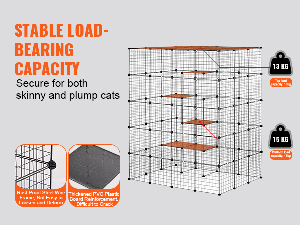Kaķu būris ir balstīts uz izturīgiem metāla rāmjiem un bieziem PVC plastmasas dēļiem, kas ir diezgan stabils gan tieviem, gan apaļīgiem kaķiem, lai tur spēlētos vai atpūstos. Jūsu kaķis var būt drošs, ka izbaudīs plašo atpūtas zonu mūsu kaķu aplokā.