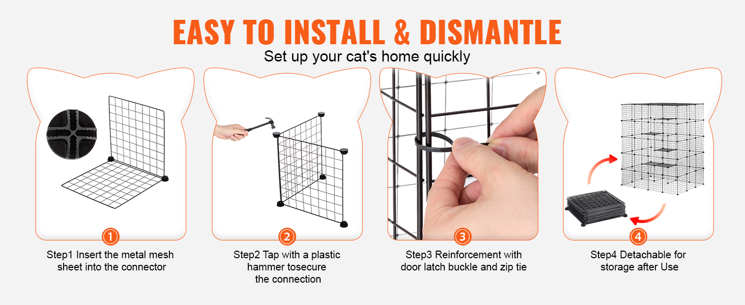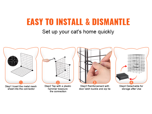 Šī kaķu rotaļu laukuma montāža ir vienkārša – katrs panelis ir aprīkots ar metāla savienotājiem un rāvējslēdzēju, tāpēc to ir viegli salikt un demontēt. Kaķu rotaļu laukuma montāžai nav nepieciešami instrumenti. Kaķu būri var pilnībā salocīt ērtai uzglabāšanai un pārnēsāšanai, kad tas netiek lietots.