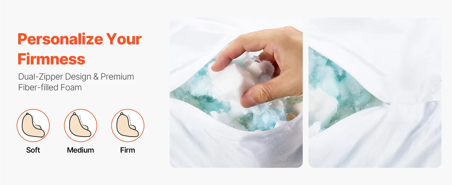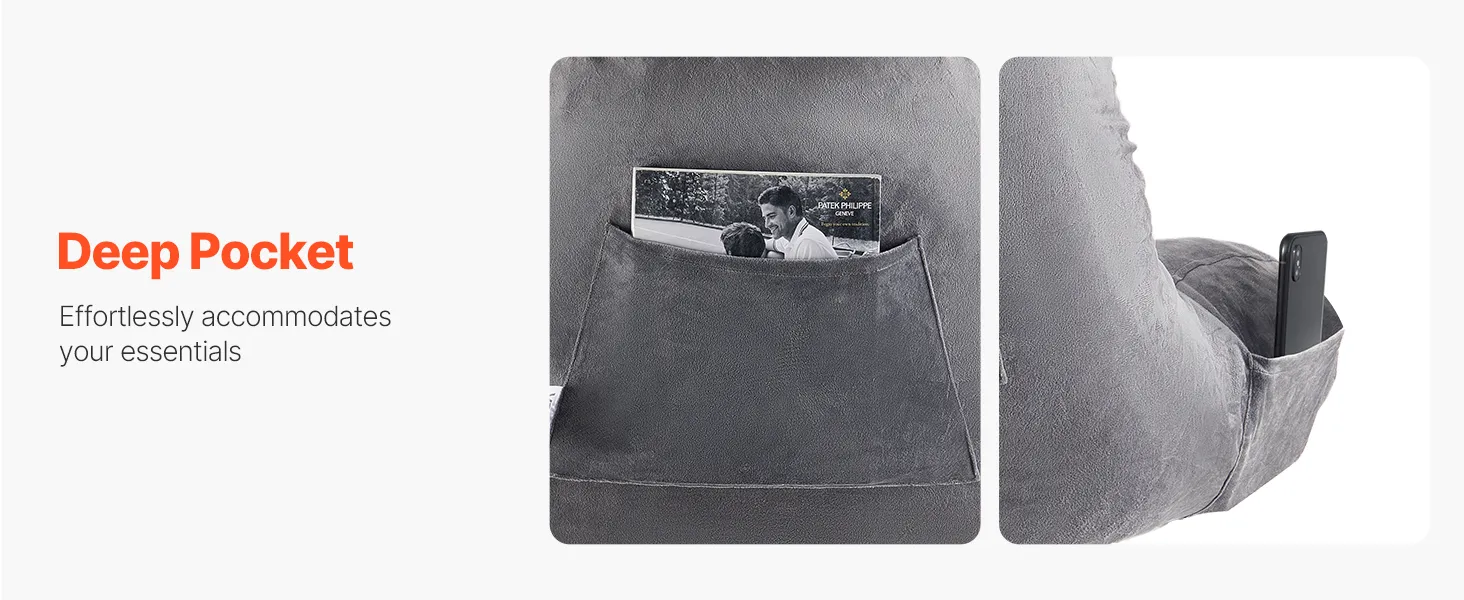 VEVOR Reading Pillow, Large Bed Pillow with Removable Headrest, Back Pillow with 3 Pockets, Shredded Memory Foam and Washable Short Velvet Cloth, Side with Handles for Reading, Gaming, Resting, Grey